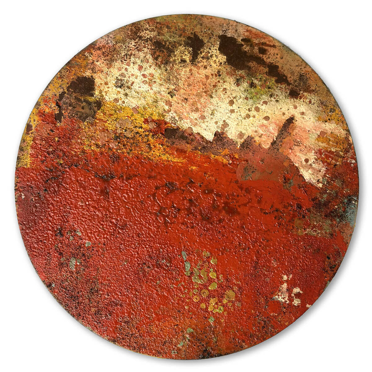 Original painting with oils and coffee burned onto circular steel plate.