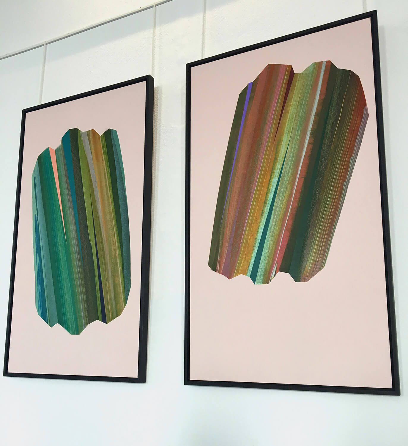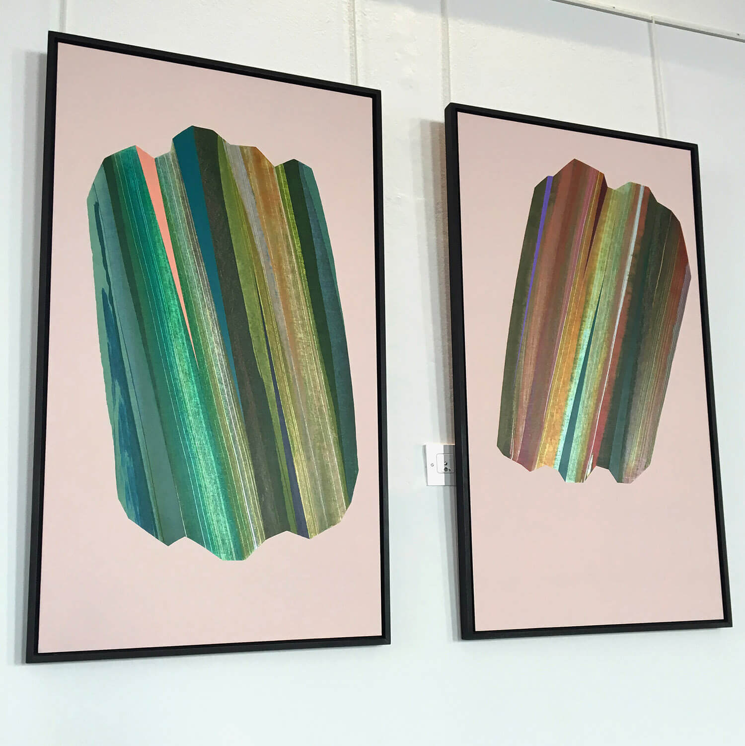 Exploring relationships between colour, surface texture, translucency and opacity, Mark’s work is made of simple shapes, underpinned by intricate detail and a distinctive palette. Evocative forms provide the basis for the works, including flag-like shapes and fantasy minerals. The realm of artifice and escape is celebrated in Mark’s vibrant and optimistic paintings, drawing inspiration from folkloric and educational imagery.