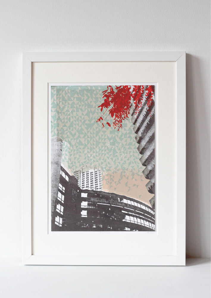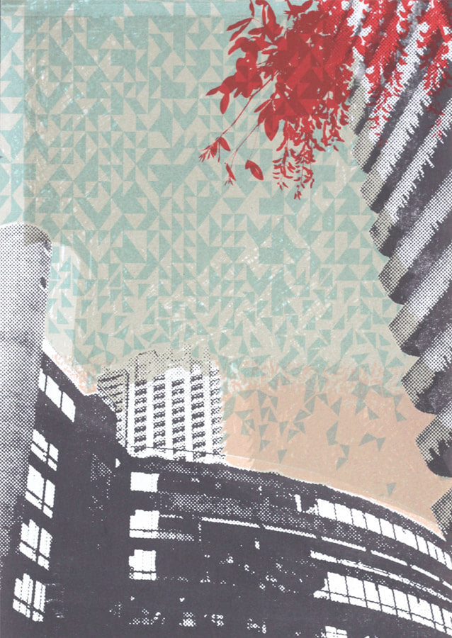 Helen Bridges is a London based artist who works predominantly in screen printing. She uses photography, drawing and typography to build up multilayered prints which are often inspired by specific locations. She tends to link recognisable objects and buildings with more abstract marks, textures and signs, representing the depth and richness of our surroundings and the city’s fabric.