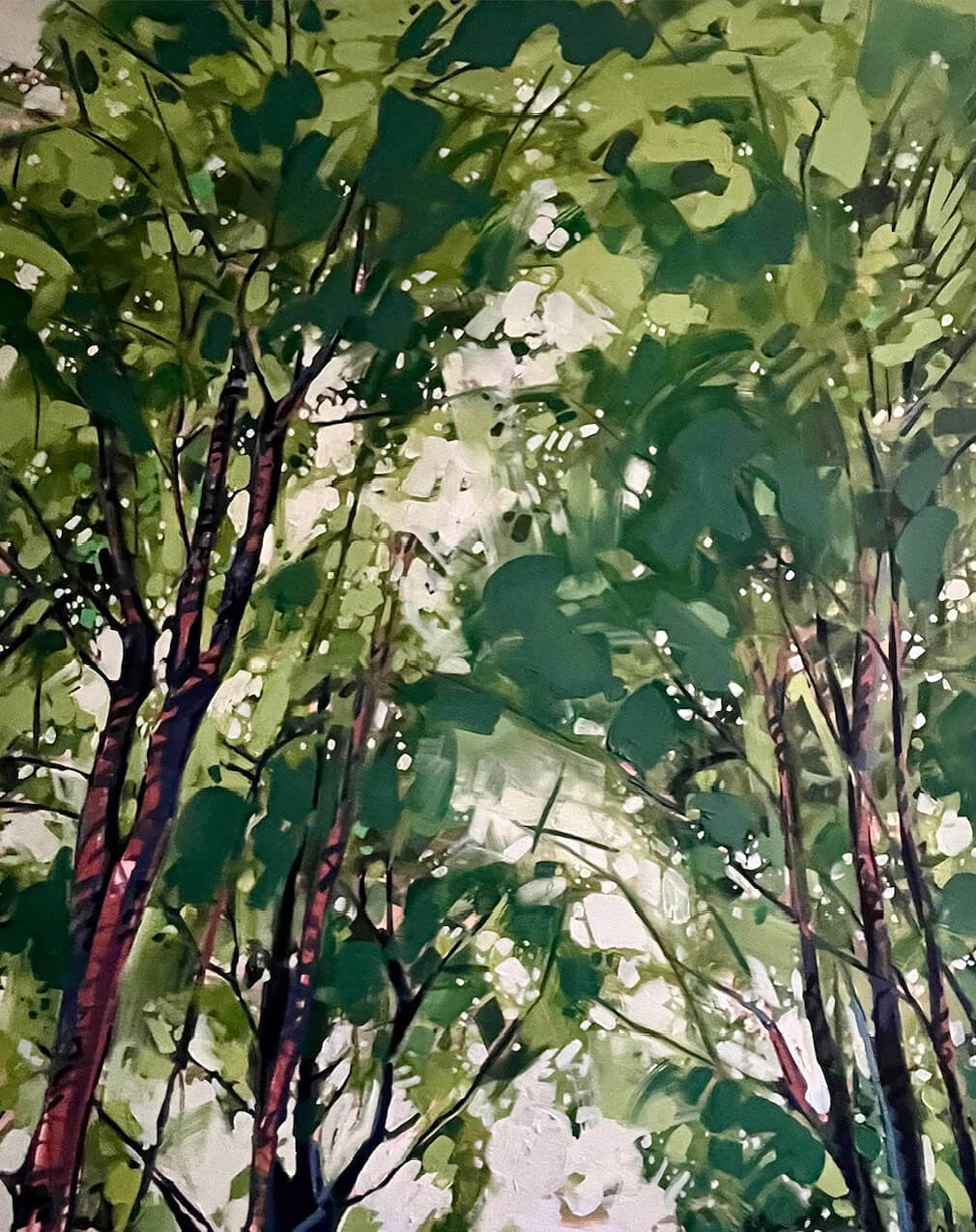 In her Acts of Expression body of work, Libby explores themes of self-representation and expression where closely cropped compositions create focus on pose and gesture. The gestural brushwork and vivid shifts of colour and tone are used to create interactions between the figure and the space. In these works there is a celebration of the joy of dressing up and using the drama of an intense colour palette along with light and shadow to describe the empowering and persistent nature of wanting and allowing yourself to be seen.