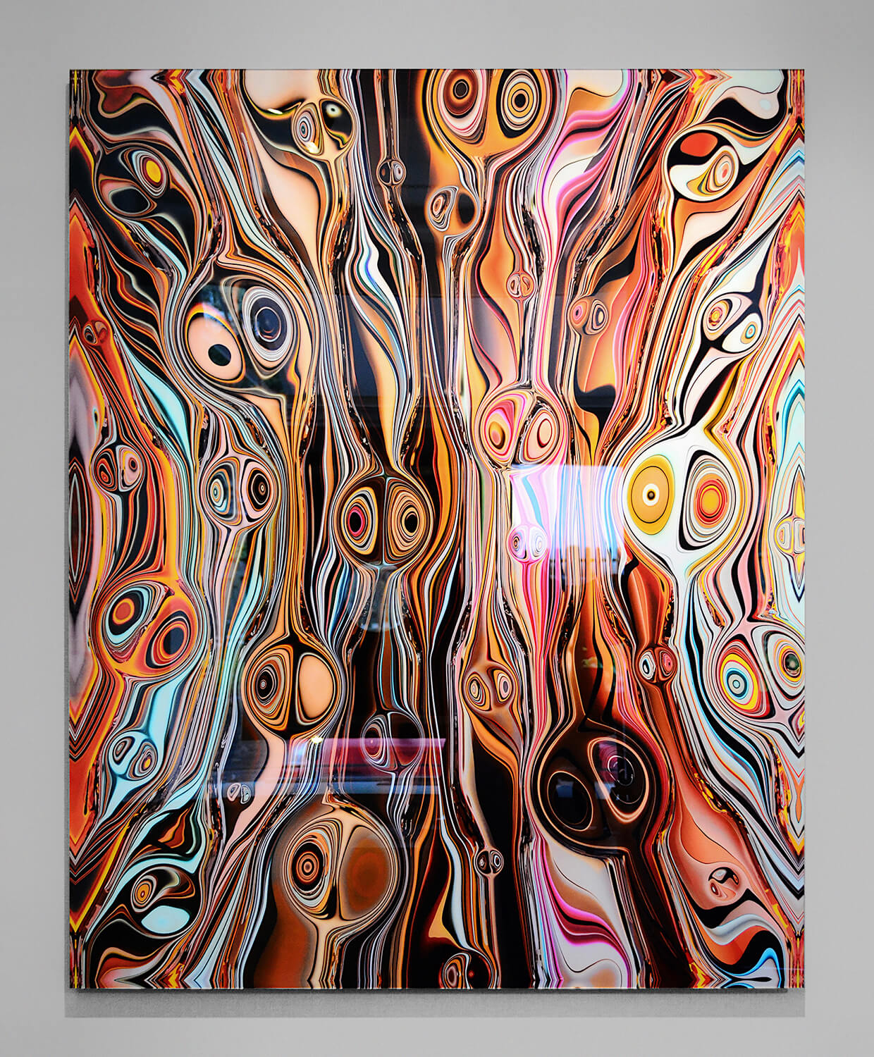 The works I generate are large format C type photographic prints. Original digital drawings exposed onto photographic paper by laser light, developed, fixed and washed in the traditional manner. These C type prints are then bonded to clear perspex using the Diasec process. The glazed pieces can then be laser cut to shape, framed, or simply mounted directly to the wall.