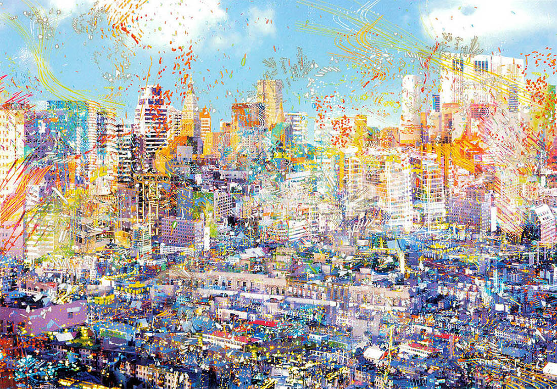 Rebecca King creates whirling patchworks of abstractions, where she is continuously trying to reinterpret what the image means within a fluctuating world of interchange. The work uses such viewpoints that the viewer is compelled to stand back and see the modern city in its speed and its immensity.