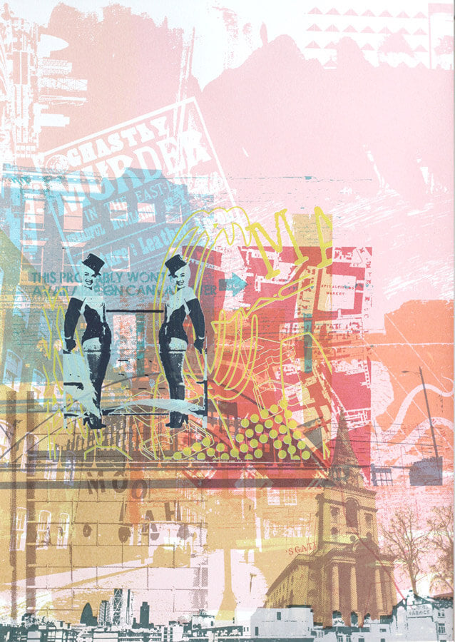 Helen Bridges is a London based artist who works predominantly in screen printing. She uses photography, drawing and typography to build up multilayered prints which are often inspired by specific locations. She tends to link recognisable objects and buildings with more abstract marks, textures and signs, representing the depth and richness of our surroundings and the city’s fabric.