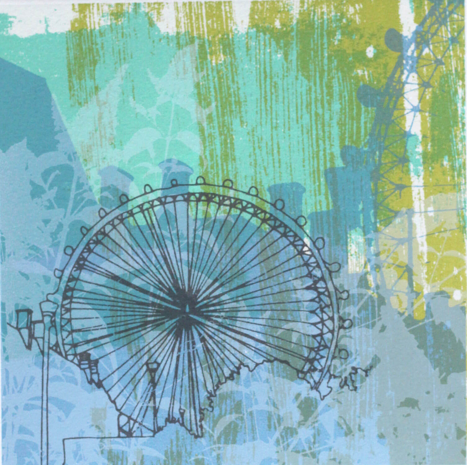 Helen Bridges is a London based artist who works predominantly in screen printing. She uses photography, drawing and typography to build up multilayered prints which are often inspired by specific locations. She tends to link recognisable objects and buildings with more abstract marks, textures and signs, representing the depth and richness of our surroundings and the city’s fabric.