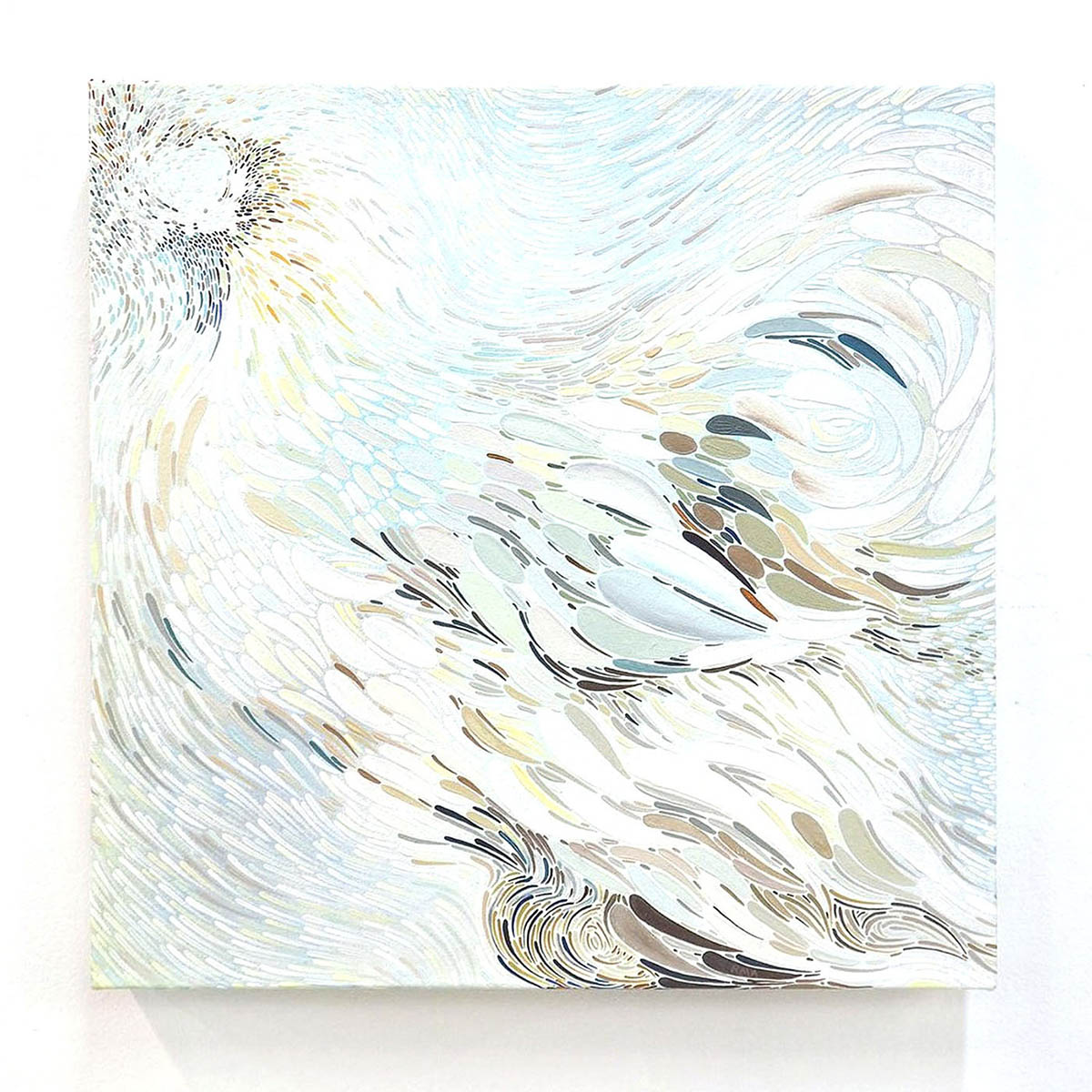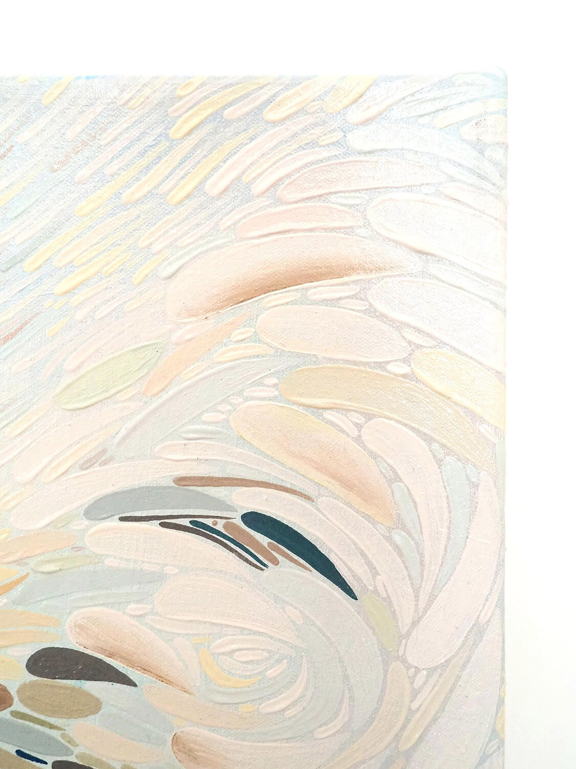 In Ruby's own words: Emphasising the beauty in ordinary and overlooked everyday objects is an important aspect in my practice. Inspired by my own home life, my latest works explore one of the most popular, yet desensitised animals, chickens. My current pieces express their unknown beauty and importance, as I explore them as both a flock and as individual characters. Taking inspiration from 17th century still life, my practice has taken the form of more abstract representation with symbolic references. Through the exploration between painting and printmaking, I enjoy the processes involved with making while focusing on small details with the use of pattern. My family home holds everything personal to me, so perhaps this body of work is at times unintentionally representational of myself.