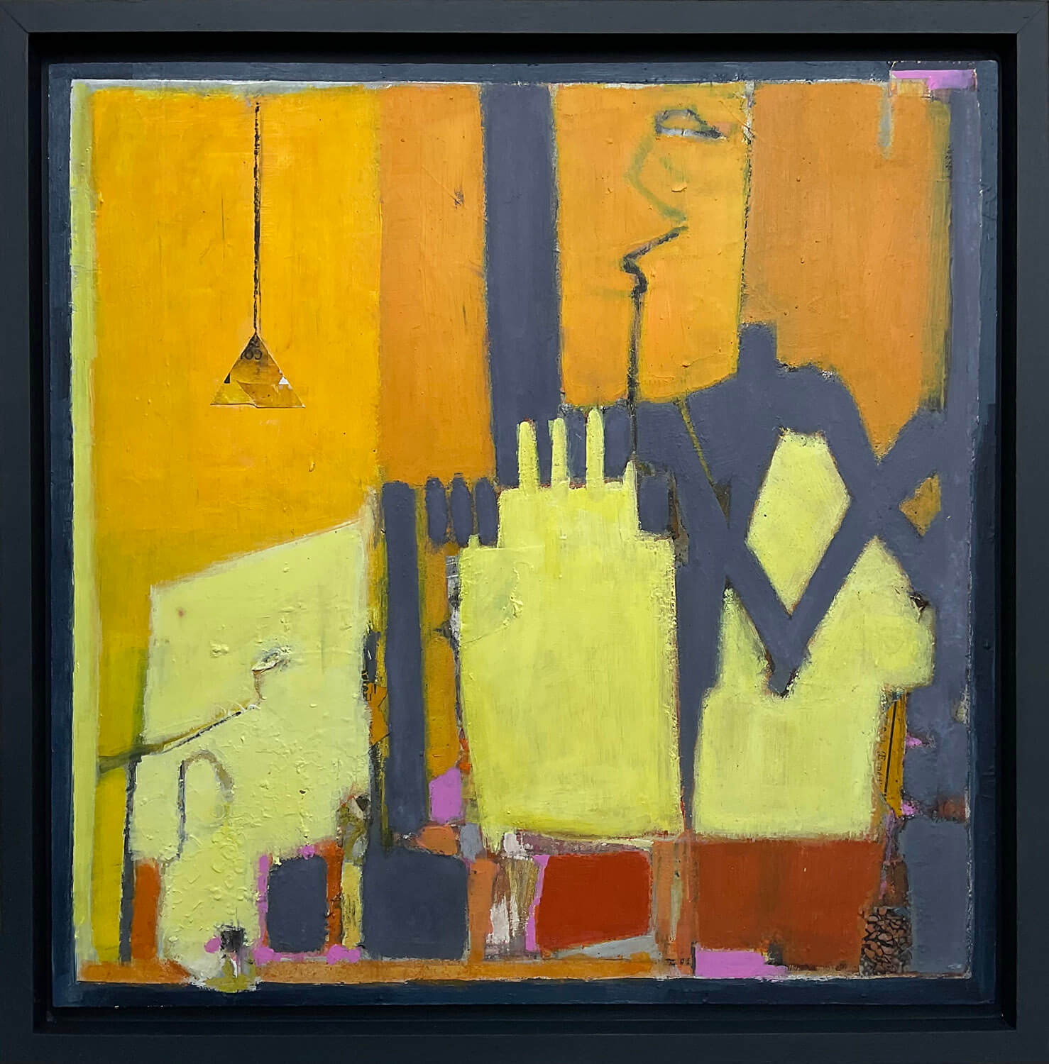 Mixed media on board with dark painted wooden frame