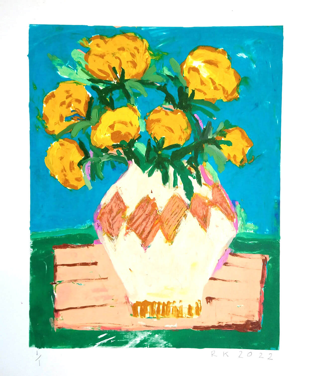 After many years exploring the fluctuating worlds of people in our ever-evolving cities in a series of vibrant prints, Rebecca has moved her focus towards a more hand-made process. This new series of still life works comprises original one-off monoprints many of which are then worked into in acrylic and pastel.