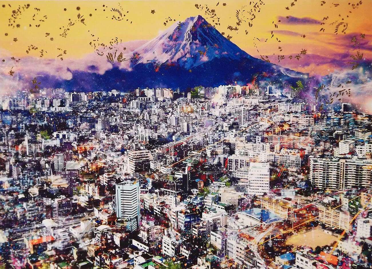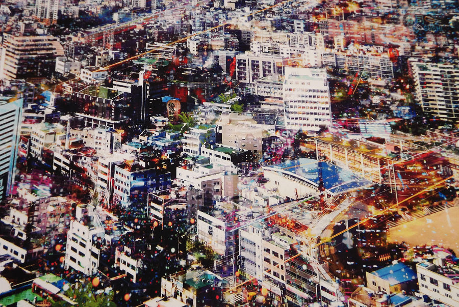 Her practice focuses upon people in our ever-evolving cities. Cities are enticing places teeming with contrasting built forms and man-made chaos, and flowing with pragmatic human activity. They offer an abundance of experiences and sensations, which are constantly in flux and shifting. It is this flux that interests Rebecca. This is represented in her work through a cascading wave of abstracted shapes and lights captured in a single moment.
