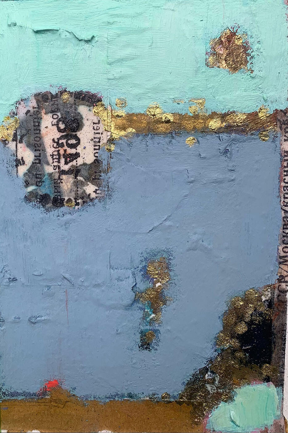 Mixed media including collage, text and gold leaf on paper with wide black mount, frame and glazing.