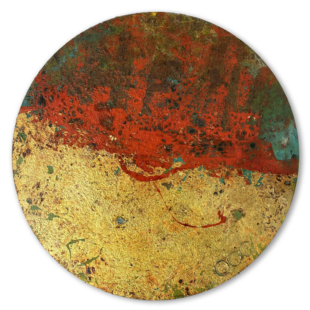 Original painting with oils and coffee burned onto circular steel plate.