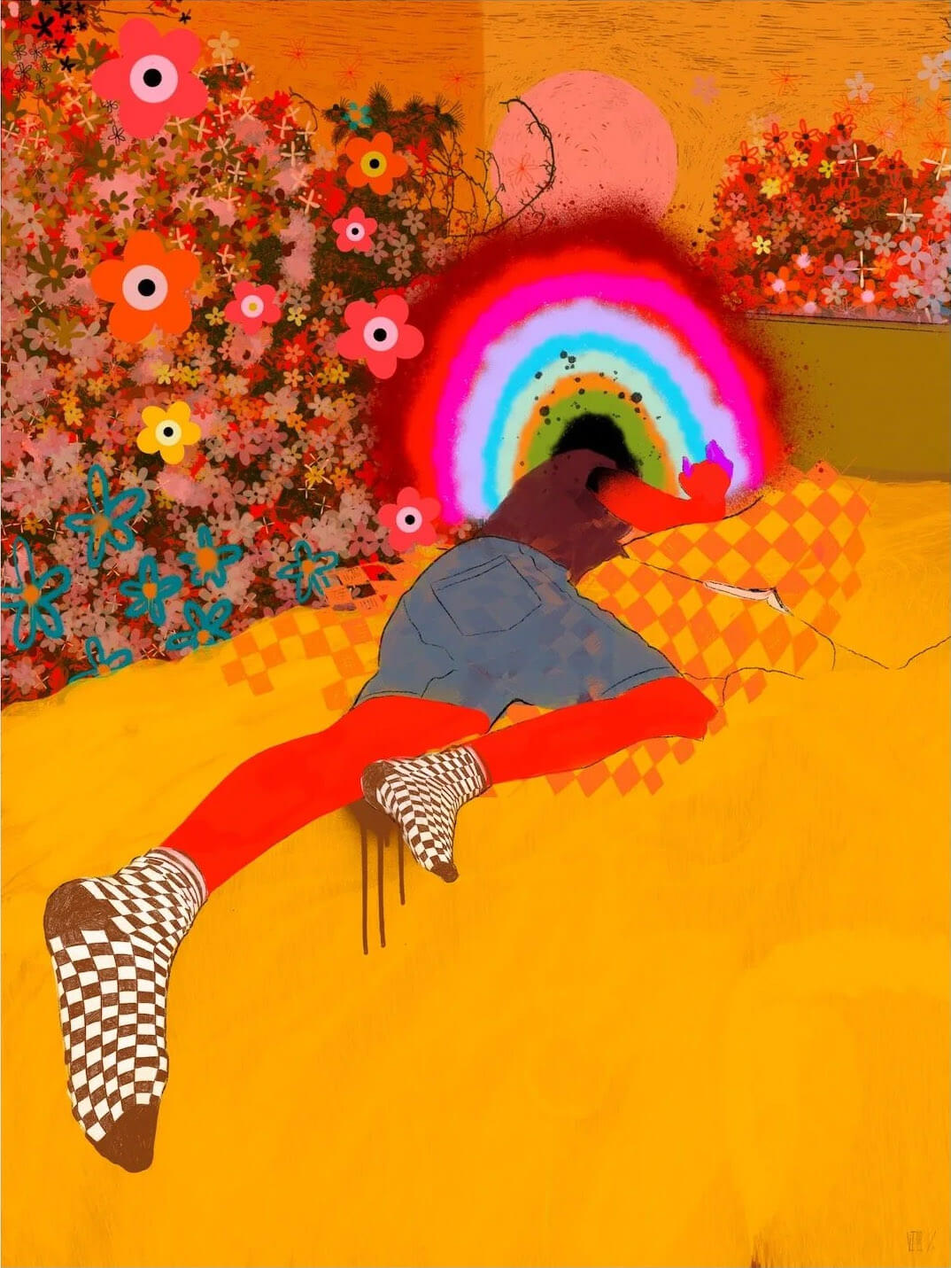 Her work is heavily influenced by music, from the styling and art direction of 1970s Jazz and Soul, to the passion and ebullience of Gospel and Disco. She takes musical aspects and works to synthesise them into visual form, working towards distilling the vibrancy of music into a ‘music for the eyes’. More broadly, she aims to impregnate her work with its own unique soul, through harnessing a blend of spirituality, culture, the cosmos and mother earth.