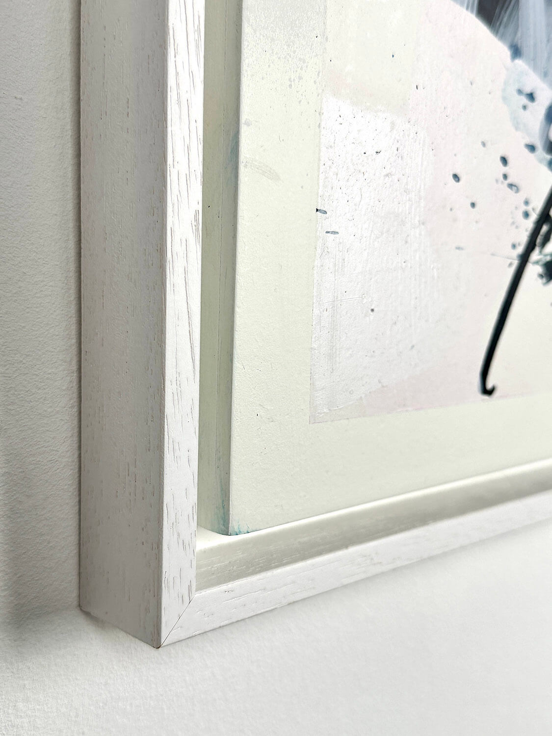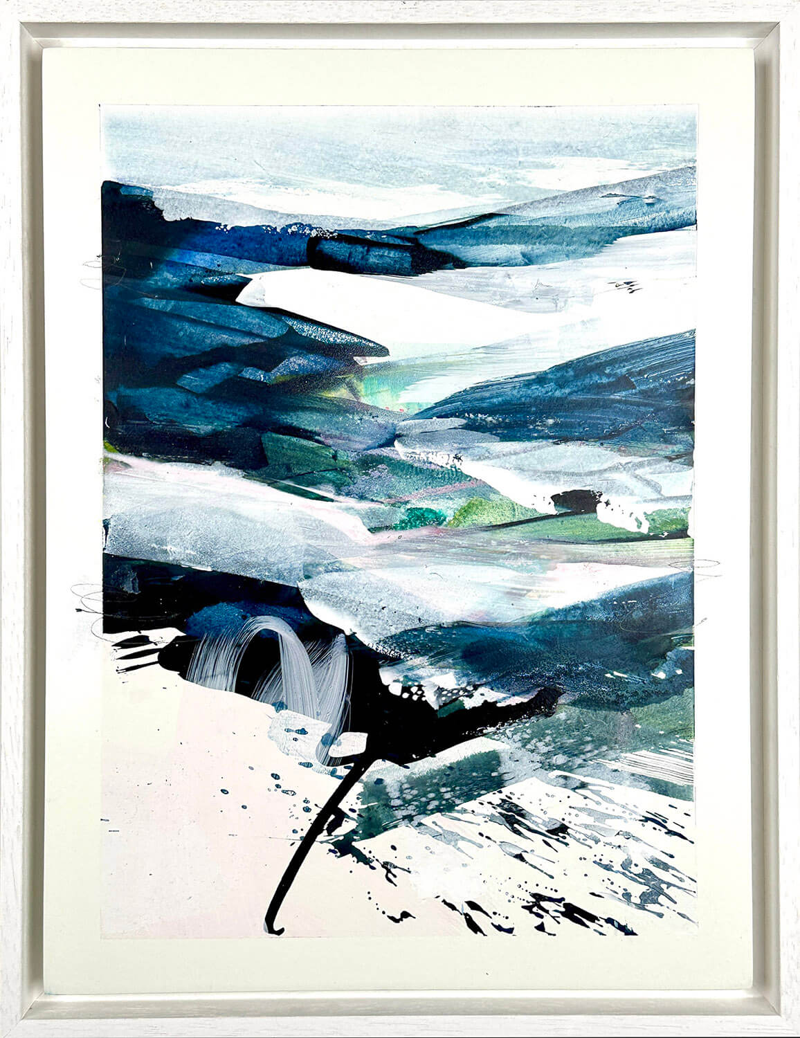 Mixed media : acrylic, ink, graphite with monoprint and screen printing on board, framed in a hand-painted white tray frame