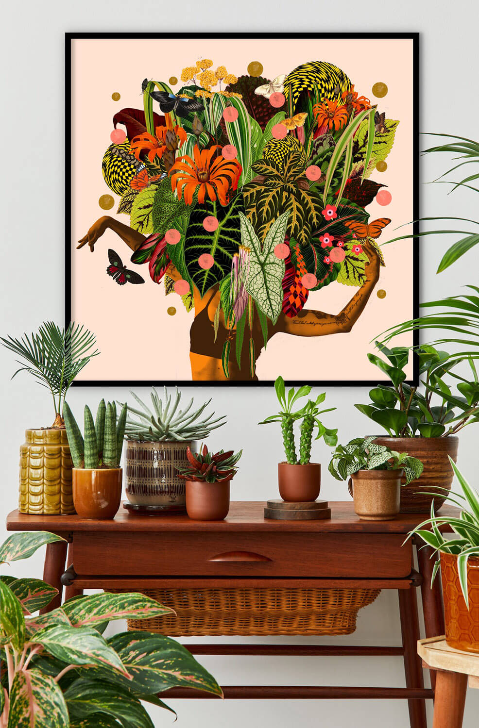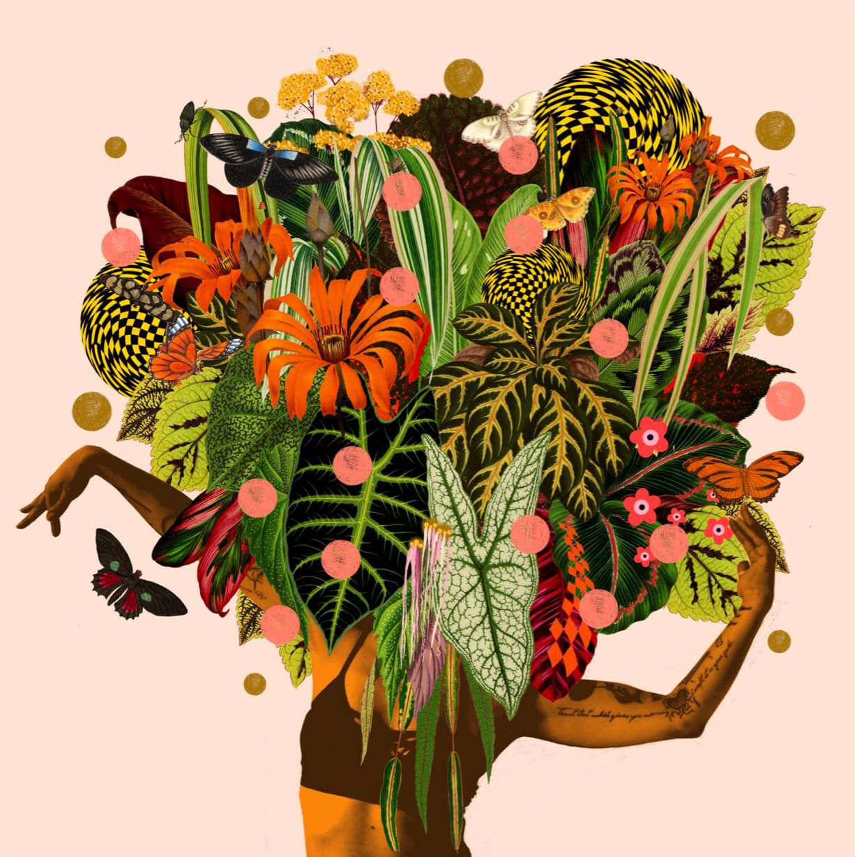 Her work is heavily influenced by music, from the styling and art direction of 1970s Jazz and Soul, to the passion and ebullience of Gospel and Disco. She takes musical aspects and works to synthesise them into visual form, working towards distilling the vibrancy of music into a ‘music for the eyes’. More broadly, she aims to impregnate her work with its own unique soul, through harnessing a blend of spirituality, culture, the cosmos and mother earth.