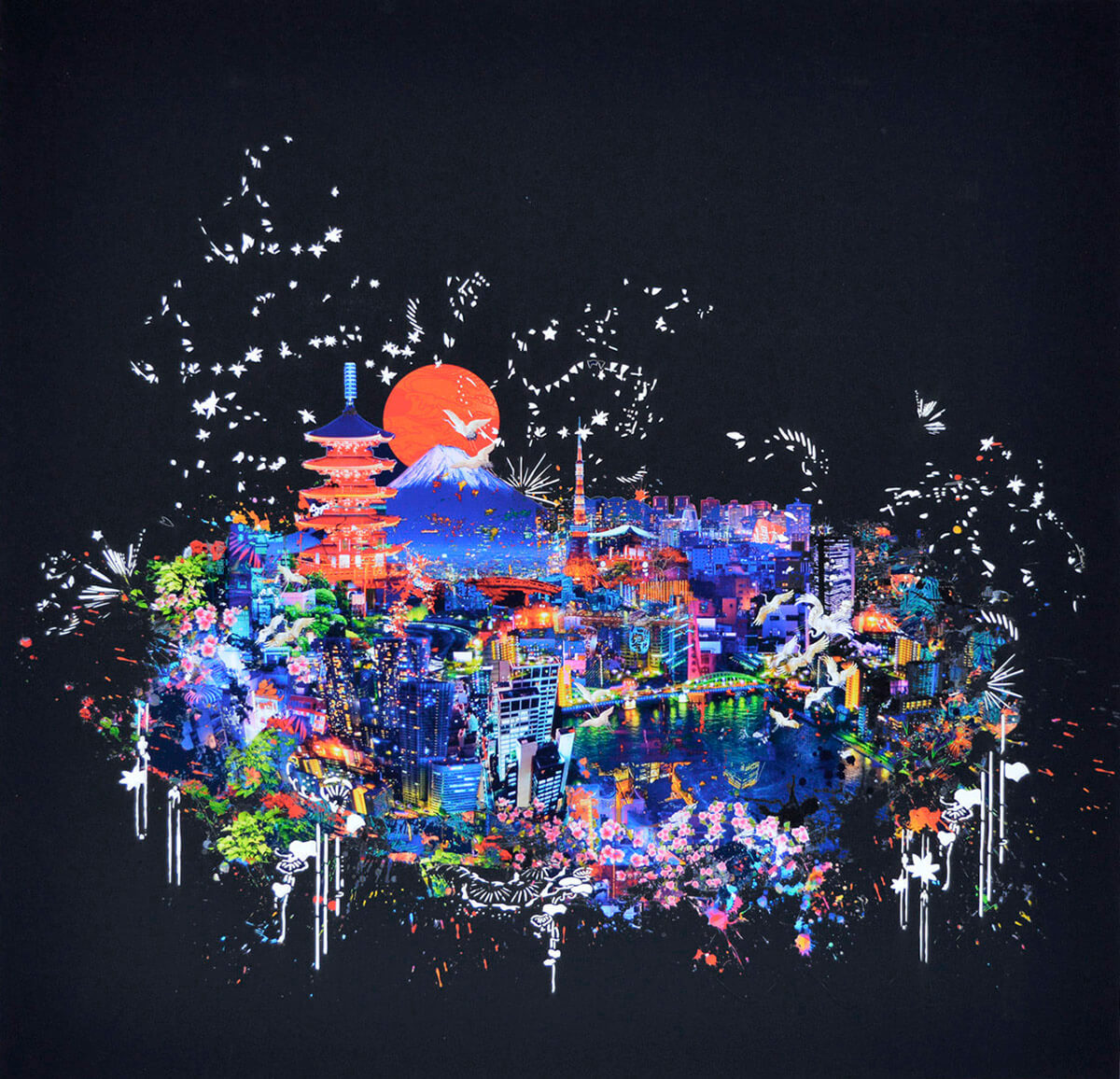Her practice focuses upon people in our ever-evolving cities. Cities are enticing places teeming with contrasting built forms and man-made chaos, and flowing with pragmatic human activity. They offer an abundance of experiences and sensations, which are constantly in flux and shifting. It is this flux that interests Rebecca. This is represented in her work through a cascading wave of abstracted shapes and lights captured in a single moment.