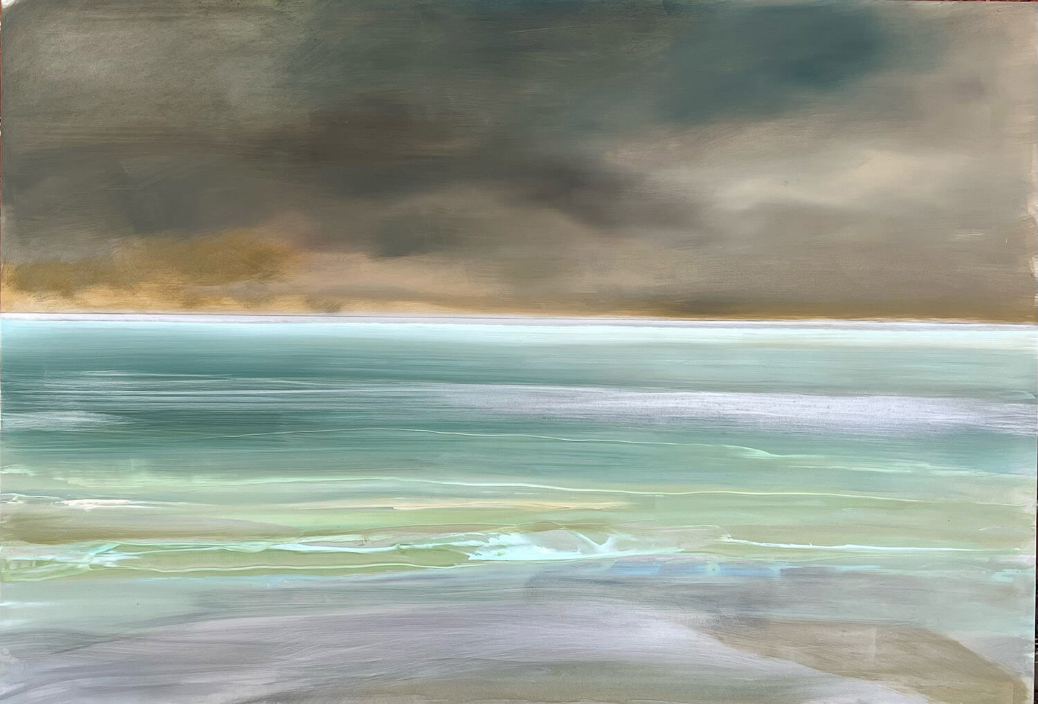 Painting on aluminium, wood and canvas, Caroline’s colour palette immediately conjures up memories of nature, sea, rocks, sky and above all light. There is a sense of drama and energy in these paintings, created by moving the paint vigorously across the surface with brush and palette knife. This is an artist who has put her trust in colour and its ability to generate air and light within an abstract framework. A painter of music as well as landscapes Caroline’s paintings have a rhythm and harmony that belies their energy.