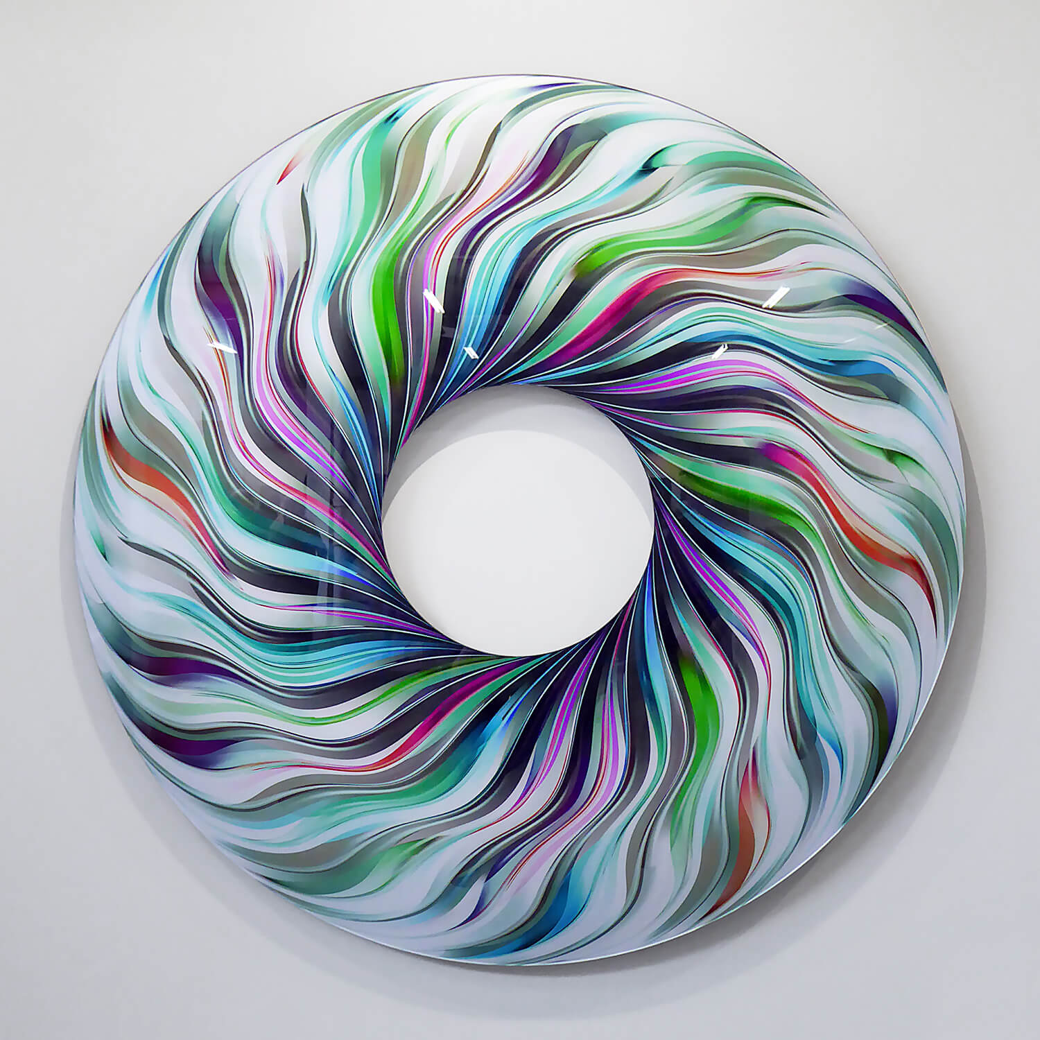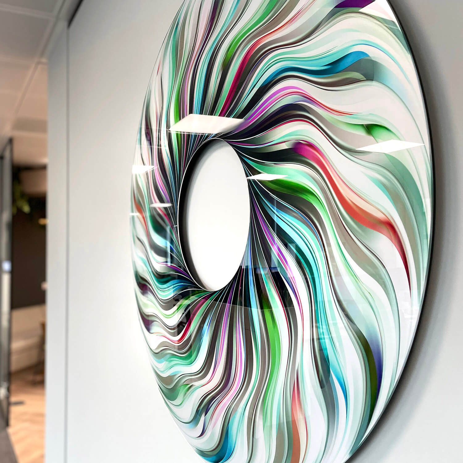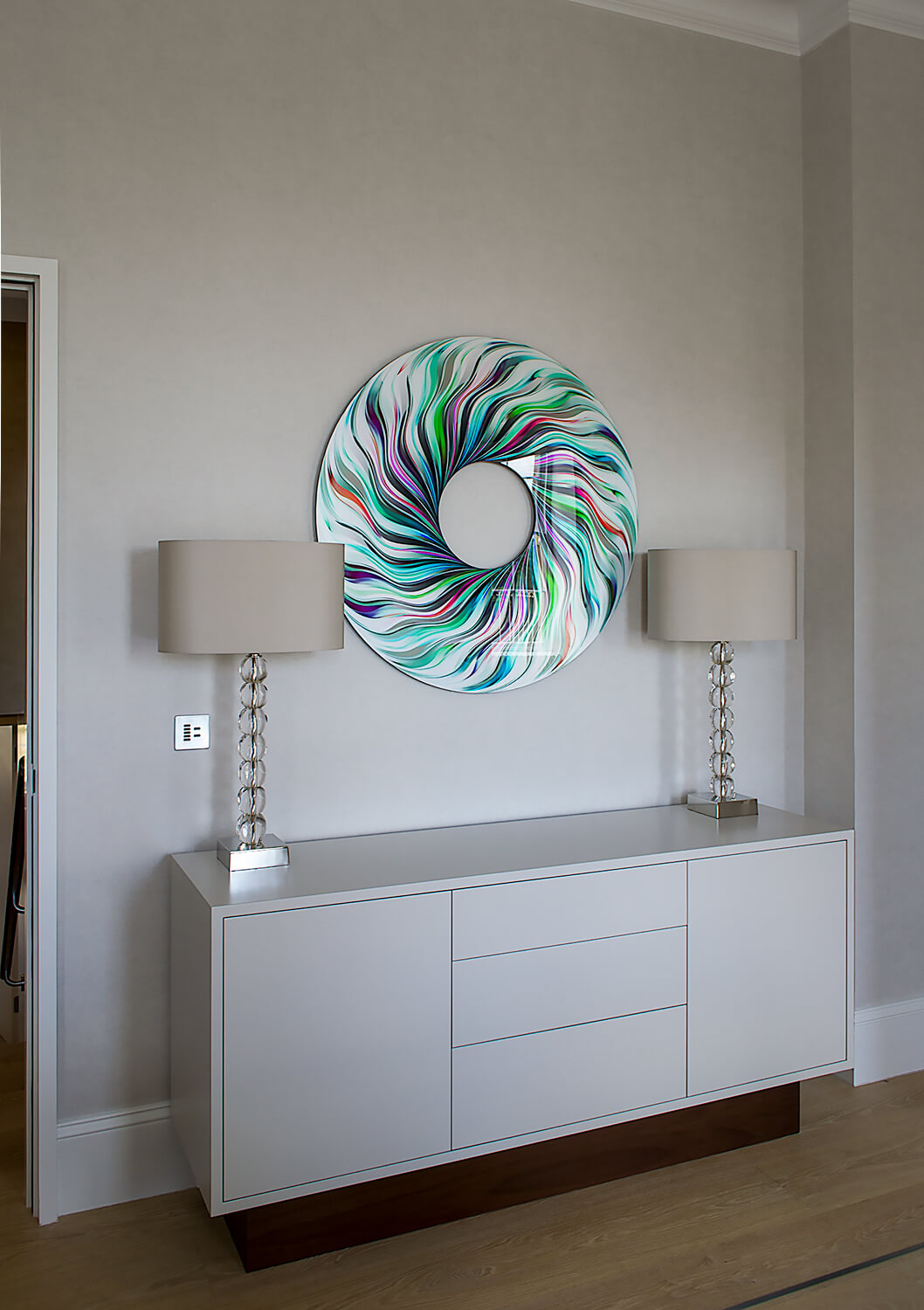 The works I generate are large format C type photographic prints. Original digital drawings exposed onto photographic paper by laser light, developed, fixed and washed in the traditional manner. These C type prints are then bonded to clear perspex using the Diasec process. The glazed pieces can then be laser cut to shape, framed, or simply mounted directly to the wall.