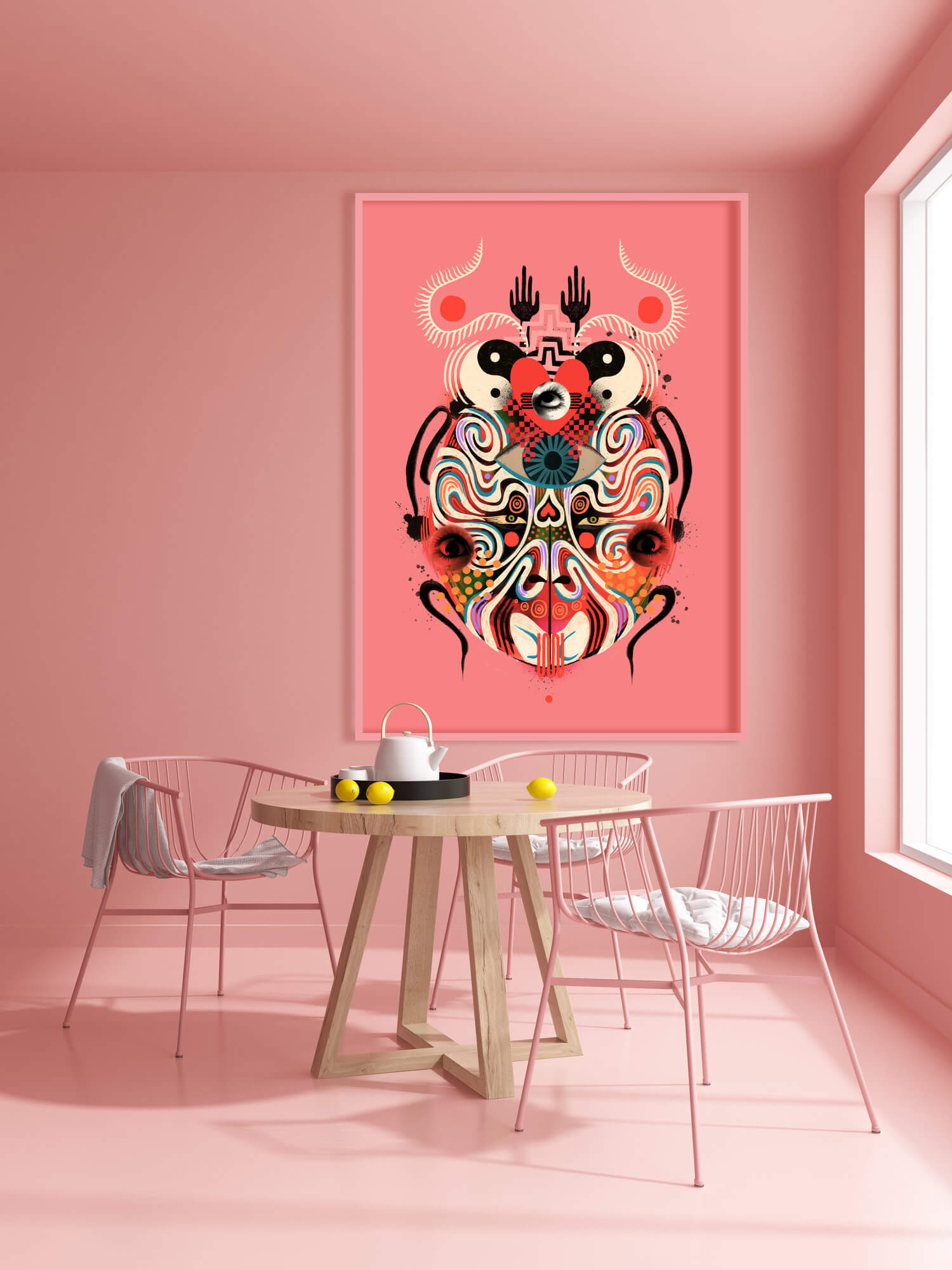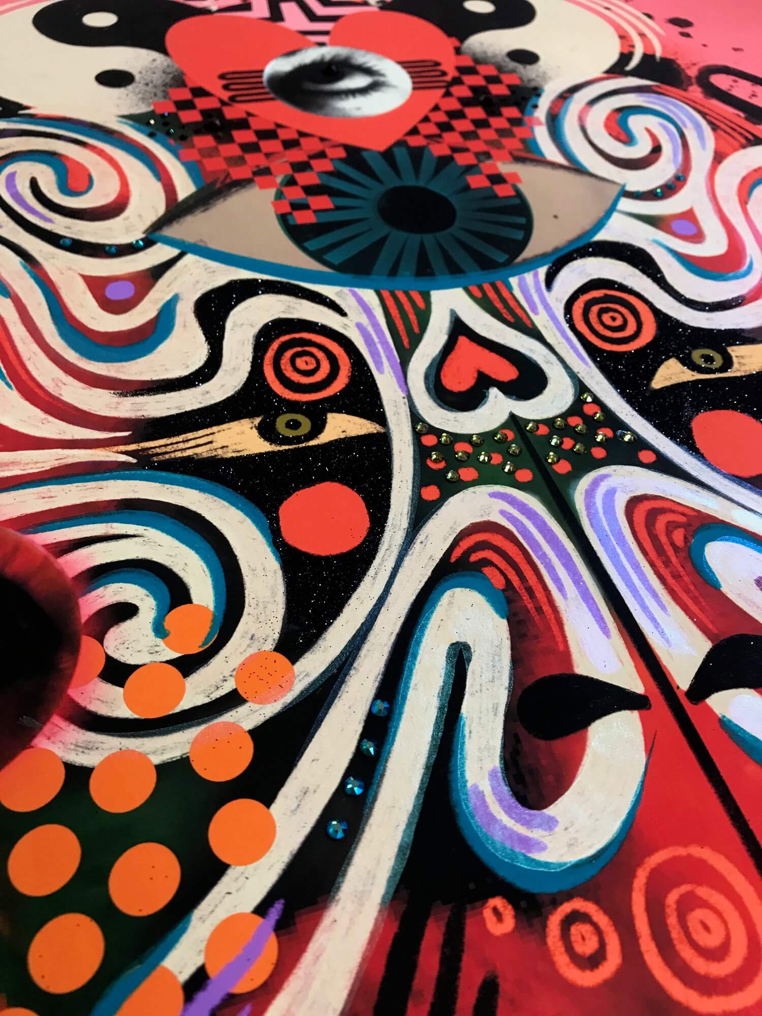 As well as producing original works and prints, Victoria is proud to be Artist Director of On The Corner Records undertaking everything on the visual side of the label. She has also had the privilege of working with Art Yard Records on Sun-Ra. Along side this she has created commercial work for brand identities; produced branding for festivals; large scale murals and has also designed nightclub interiors. In addition, she also works on historic interiors – digitally recreating wallpapers for some of the most prestigious heritage sites in the UK.
