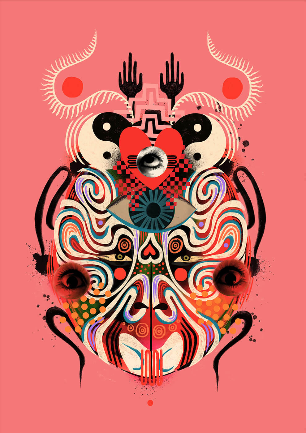 Victoria has worked as an artist and illustrator since graduating with a BA in Illustration in 2008. Her pieces are created by building up multiple textures and images, and combining these to develop a distinct visual language, using recurring motifs. She works using a fusion of technology and traditional techniques – often using photography, painting, gold-leaf and cut-up collage which is then digitally scanned and arranged on the computer, before working back in to the resulting digital print.