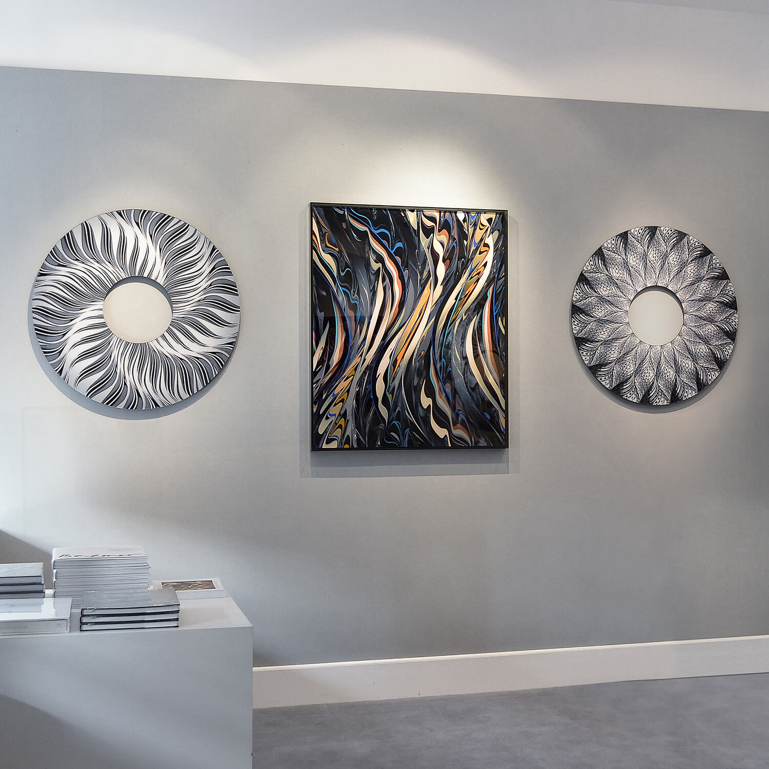 The 100cm edition is be fitted with a bespoke, laser cut, transparent black Perspex frame, whilst the 55cm edition works well with an ultra minimal black alloy frame, upon request.