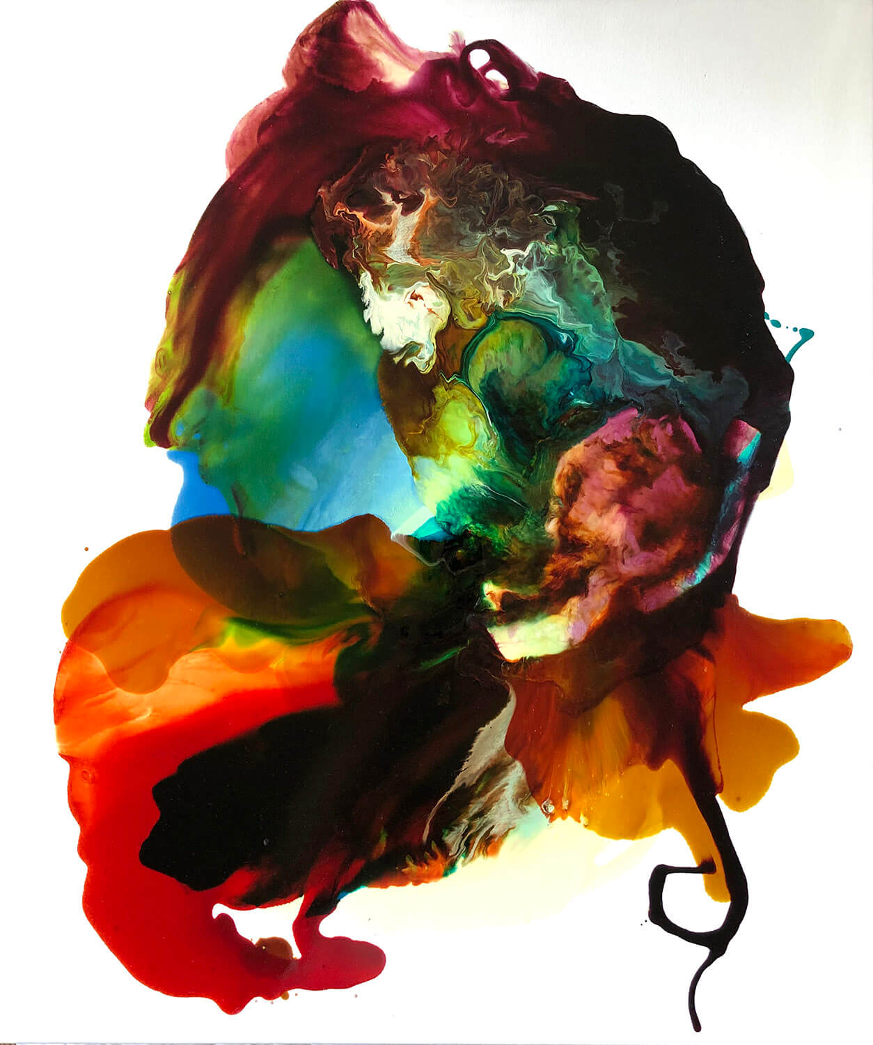 'My latest body of work, 'Love Circus', explores an altogether different, but equally complex terrain, that of the human heart. Here, I am able to express the emotions more precisely through the blending of colours combined with layers of poured paint: thereby creating a more deliberate and sometimes disturbing tension to the subject.'