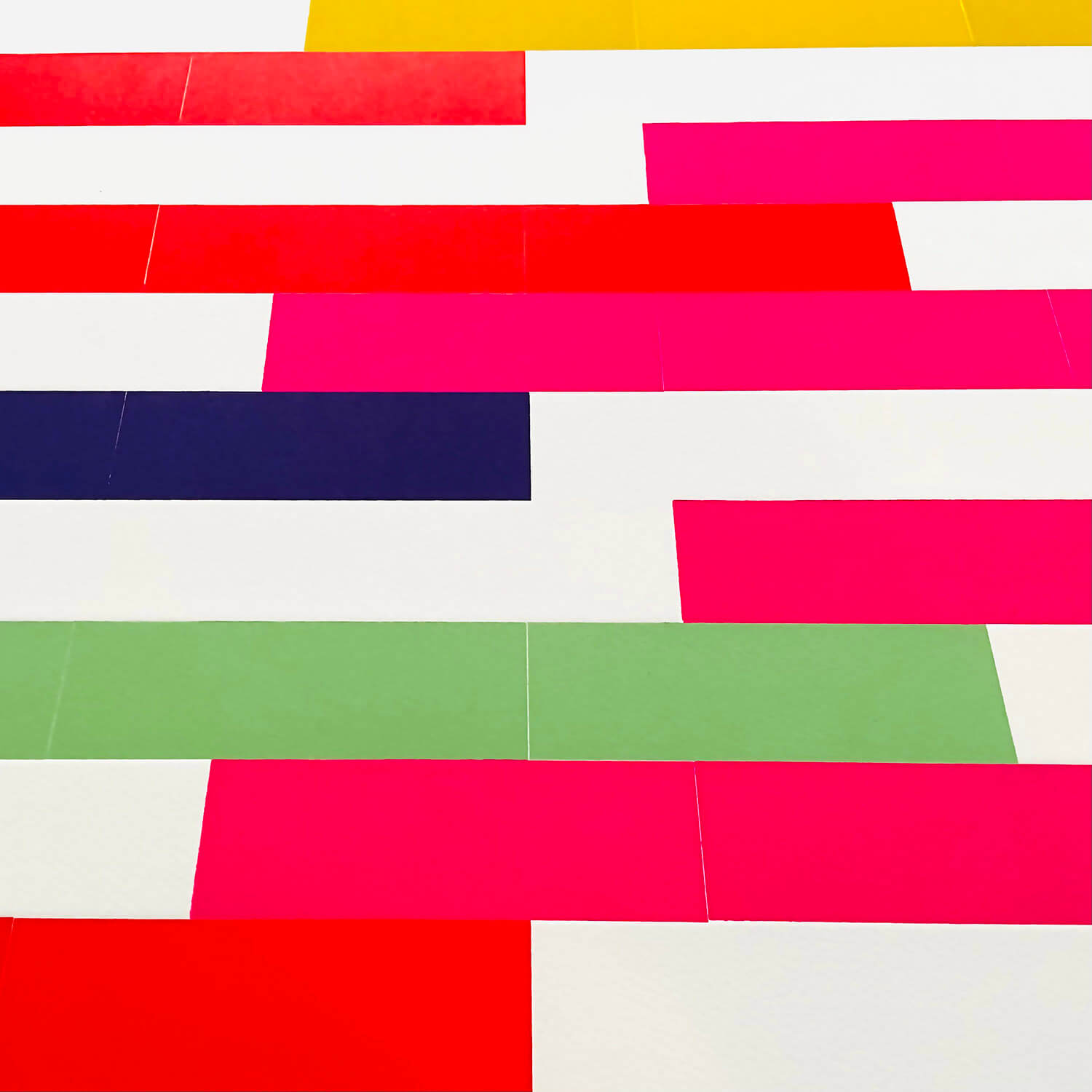 Some of his prints are made by rolling and then removing areas of pure flat colour from the plate, others involve more painterly gestures. In addition, he often uses hand or laser-cut stencils either to hold or conceal areas of ink, which add a further embossed dimension to the prints. Occasionally the prints include collaged elements.