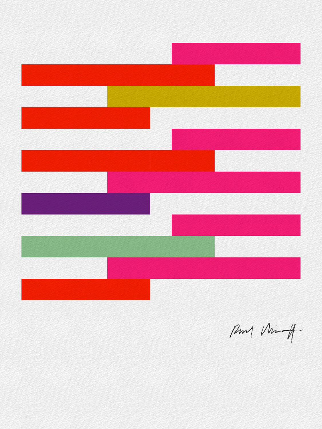 In Paul Minott's words: “Ultimately, my monoprints are all about experimentation. It’s like using an etching press to paint pictures in the dark; the magic that occurs between the blankets can never be entirely known beforehand, and one feels one’s way with each successive stage. Setting out with only a slight notion, often just a shape or a colour, one sets in motion a sequence of events that take on a life of their own. A finished print is resolved when the components coexist in either conflict or harmony. I never know which until it’s over, when it finally suggests something that was there all along.”