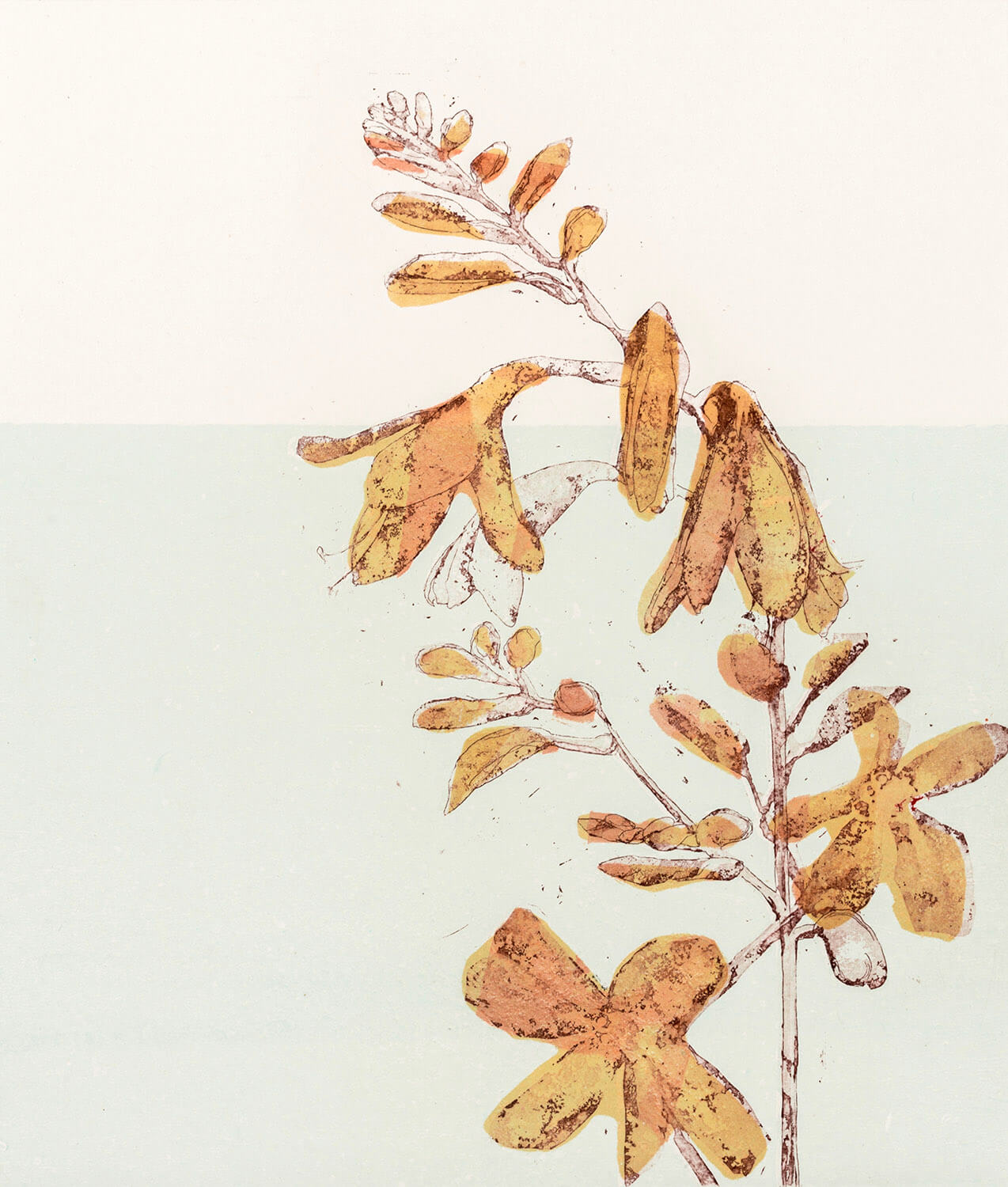 Cliff tops, sculptural boulders, trees blasted by gales, flowers, patches of hedgerow and rock pools remain key subjects for her printmaking. Working from her alfresco sketches, she etches onto copper plate using a variety of traditional processes. The subsequent etchings are incredibly tranquil and beautiful, carefully depicting fragile flora and hardy minerals after years of exposure to the coastal elements.