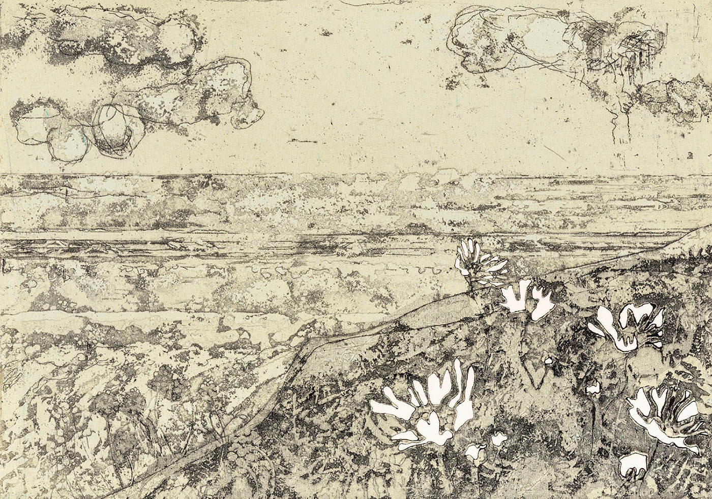 Cliff tops, sculptural boulders, trees blasted by gales, flowers, patches of hedgerow and rock pools remain key subjects for her printmaking. Working from her alfresco sketches, she etches onto copper plate using a variety of traditional processes. The subsequent etchings are incredibly tranquil and beautiful, carefully depicting fragile flora and hardy minerals after years of exposure to the coastal elements.