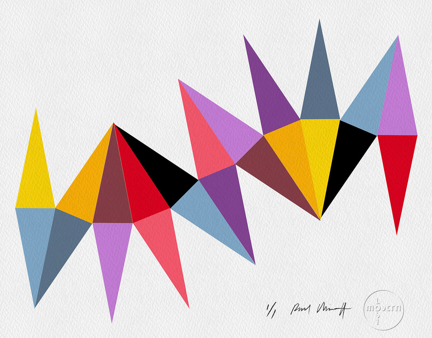 In Paul Minott's words: “Ultimately, my monoprints are all about experimentation. It’s like using an etching press to paint pictures in the dark; the magic that occurs between the blankets can never be entirely known beforehand, and one feels one’s way with each successive stage. Setting out with only a slight notion, often just a shape or a colour, one sets in motion a sequence of events that take on a life of their own. A finished print is resolved when the components coexist in either conflict or harmony. I never know which until it’s over, when it finally suggests something that was there all along.”
