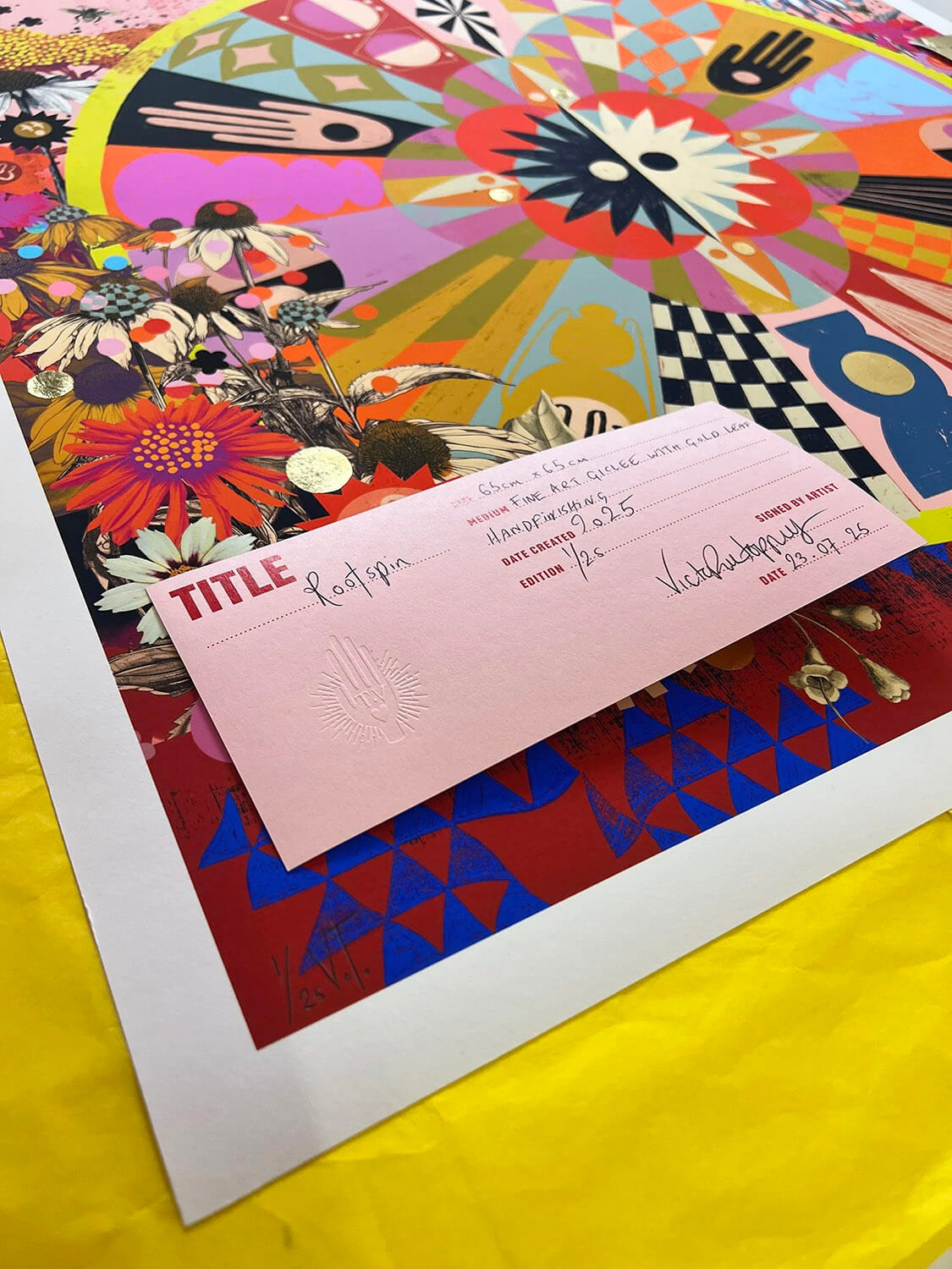 Gallery quality giclee print, highly hand-finished in gold leaf, on 300gsm 100% cotton rag paper with waterbased UV resistant inks. Limited edition of 25.