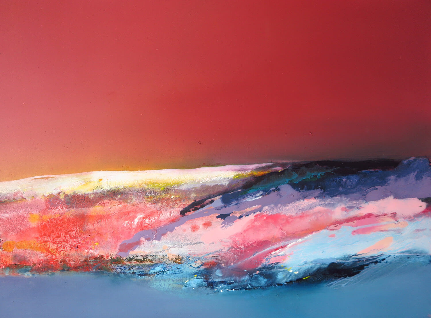 Sketches on location form a starting point for her canvases and through distortion, exaggeration, poured paint, thick texture, smooth brushstrokes and incidental marks the canvas becomes alive with energy and atmosphere. Serene calm is interjected with powerful explosions of colour to produce unique and captivating portrayals of nature in its wildest forms.