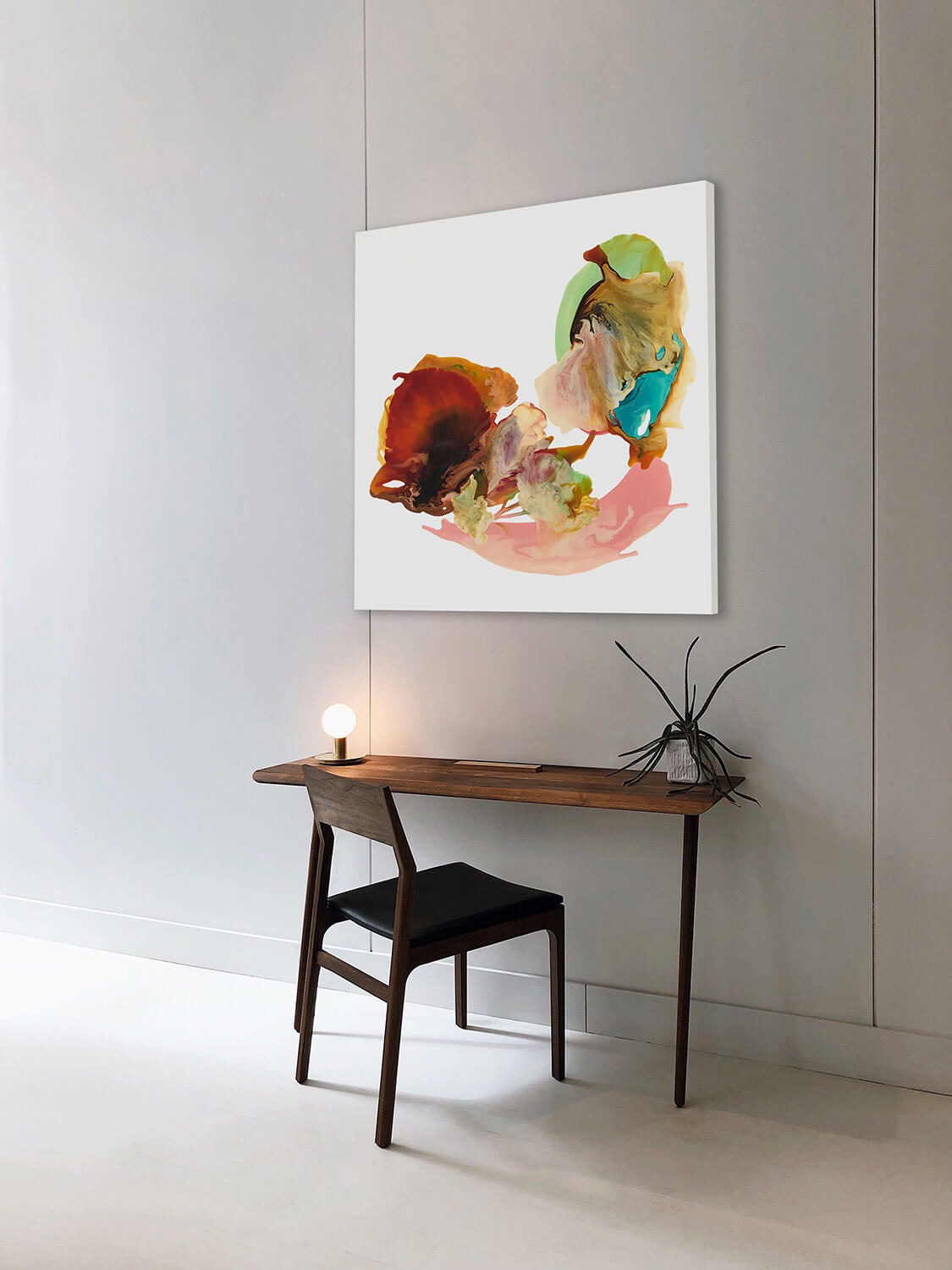 In Jane Emberson's words: 'The two simple elements of shape and colour form the basis for all my work. They provide an endless source of fascination and means of expression. For the past few years I have concentrated on creating imaginary landscapes using a variety of fluid paints and mediums with the act of pouring playing a vital part in describing a once thriving force - that of nature itself.