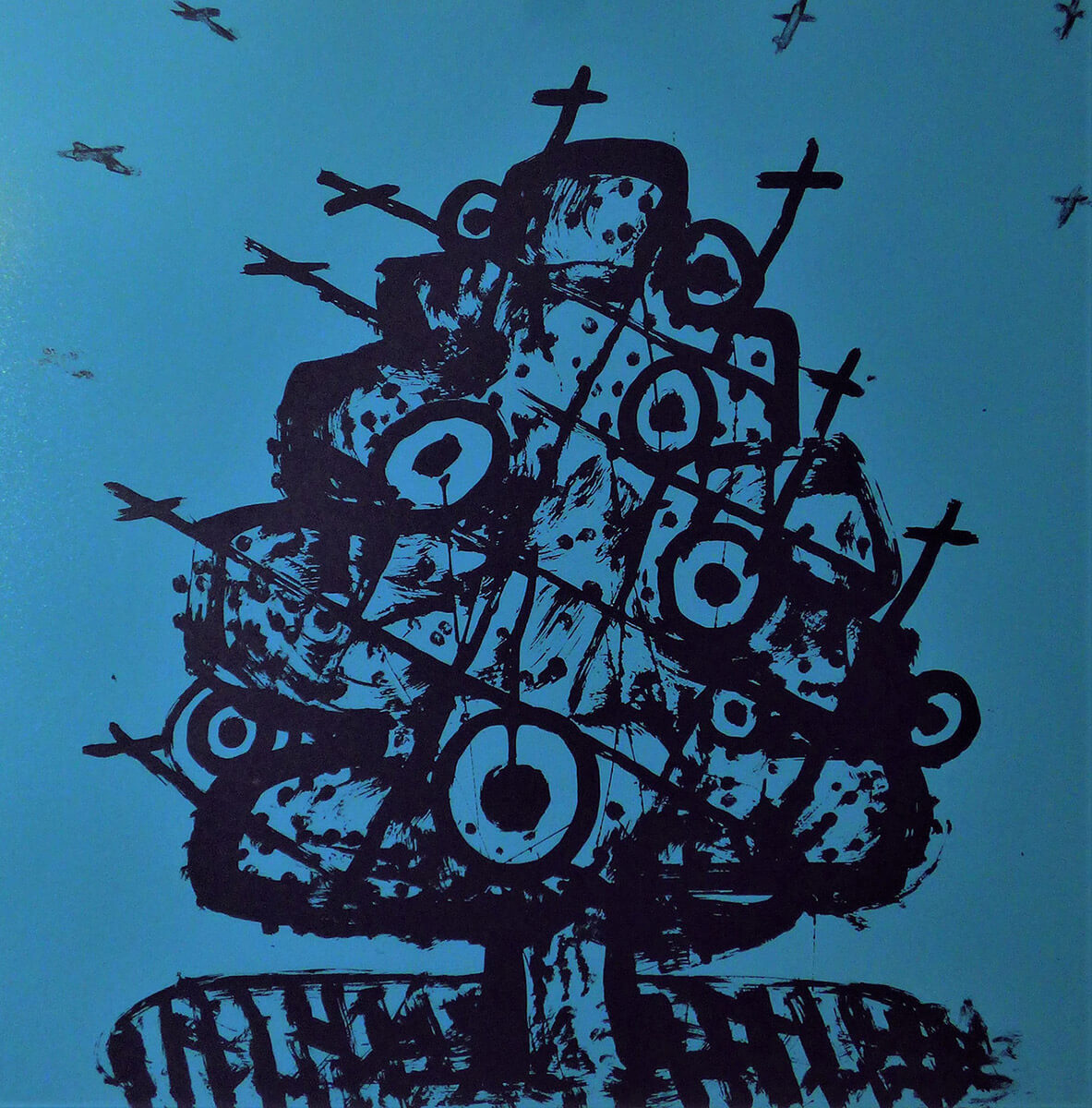 Since moving here in 2015, the environment has rekindled Alexander’s childhood memories of the old farm buildings and trees that were his playground as a child. Cycling and driving around in this new area over the last year has had a profound affect on his work. Buildings, trees and pictorial elements are climbing back into the canvasses to make their home amongst the abstract images. The new work is a collage combining memories from his youth with his new surroundings, as if time is elastic and the past can co-exist with the present. He finds it comforting that rural Sussex has changed so little over the last forty years, although cities are becoming homogenised and increasingly unrecognisable to him.