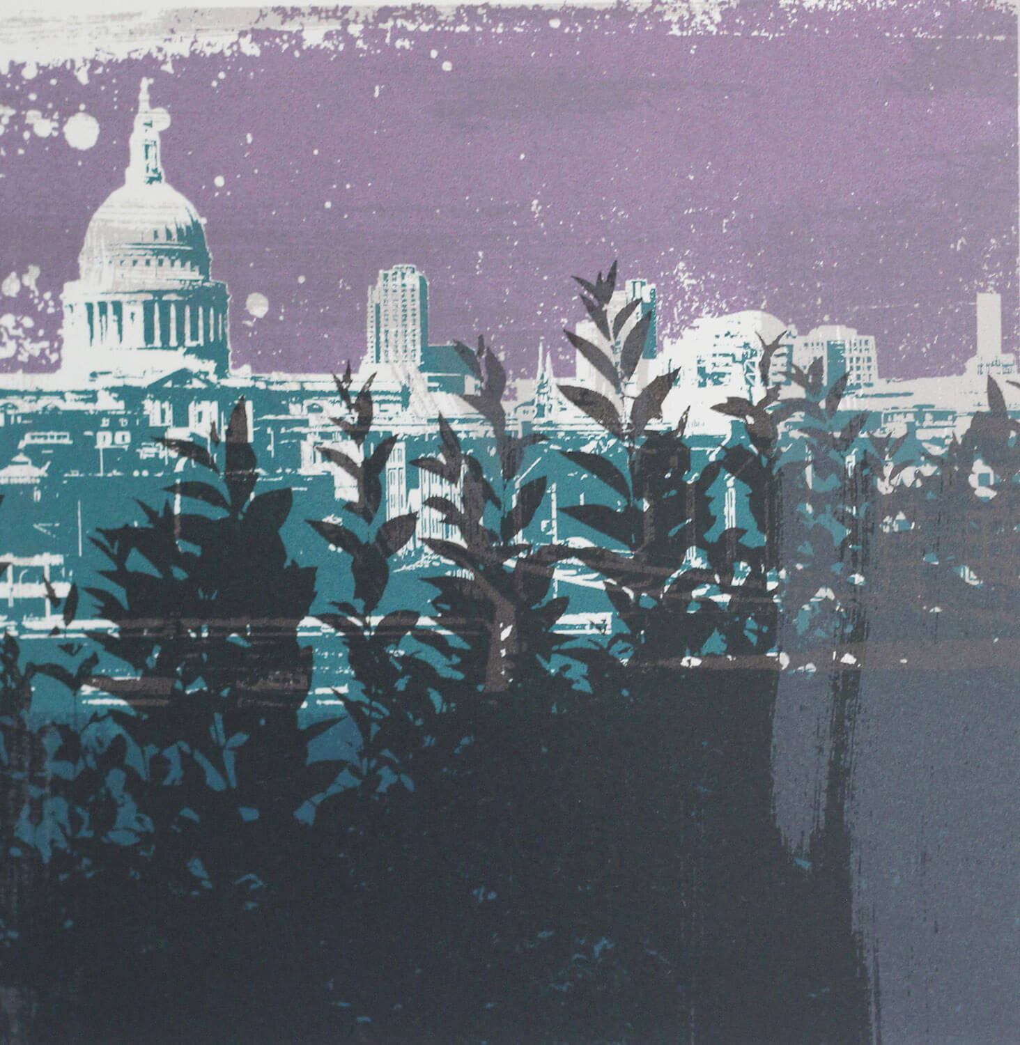 Helen Bridges is a London based artist who works predominantly in screen printing. She uses photography, drawing and typography to build up multilayered prints which are often inspired by specific locations. She tends to link recognisable objects and buildings with more abstract marks, textures and signs, representing the depth and richness of our surroundings and the city’s fabric.