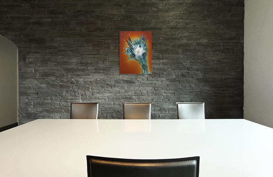 Adam’s pieces are created as marble frescoes. Layer by layer, coats of crushed marble composite are applied to the canvas and built up to create a veneer-like marble base. Further layers are pigmented and applied, textured and polished before paint, minerals, aggregates, base and precious metals, pigments and other materials can then be incorporated within the work. Running parallel to this process, Adam also became interested in the qualities and imagery unveiled through the quarrying, splitting and polishing of ancient stones, minerals and fossils.