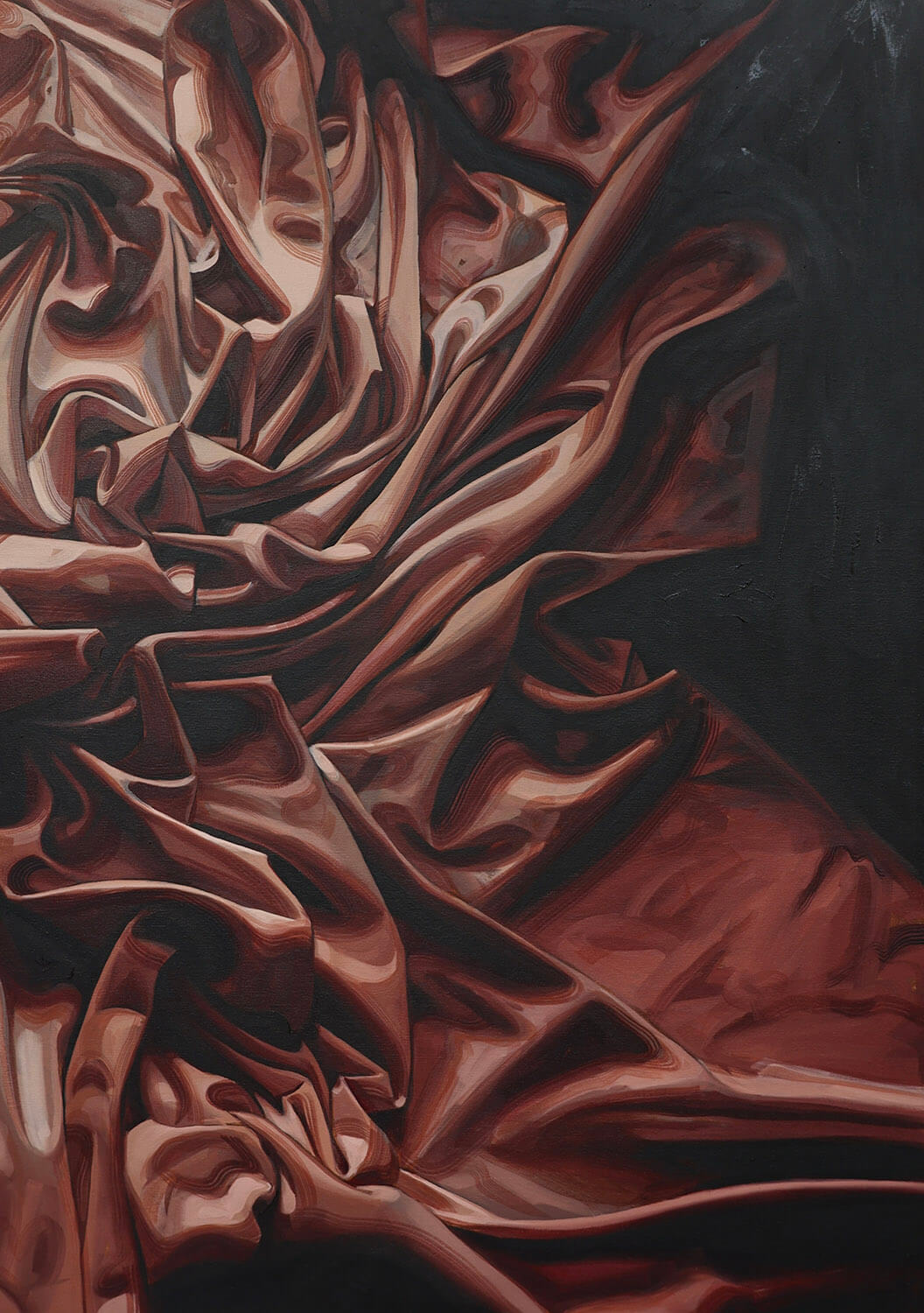 In her current body of work ‘Umbra’, Libby focuses on large-scale still life draping forms exploring the interplay and transience of shadow and light. Luminous surfaces and refined gradations of tone within cropped compositions create immersive visual experiences for the viewer. The painting evokes a sense of movement and shifting shapes – changing from a twisting figure to rising smoke.