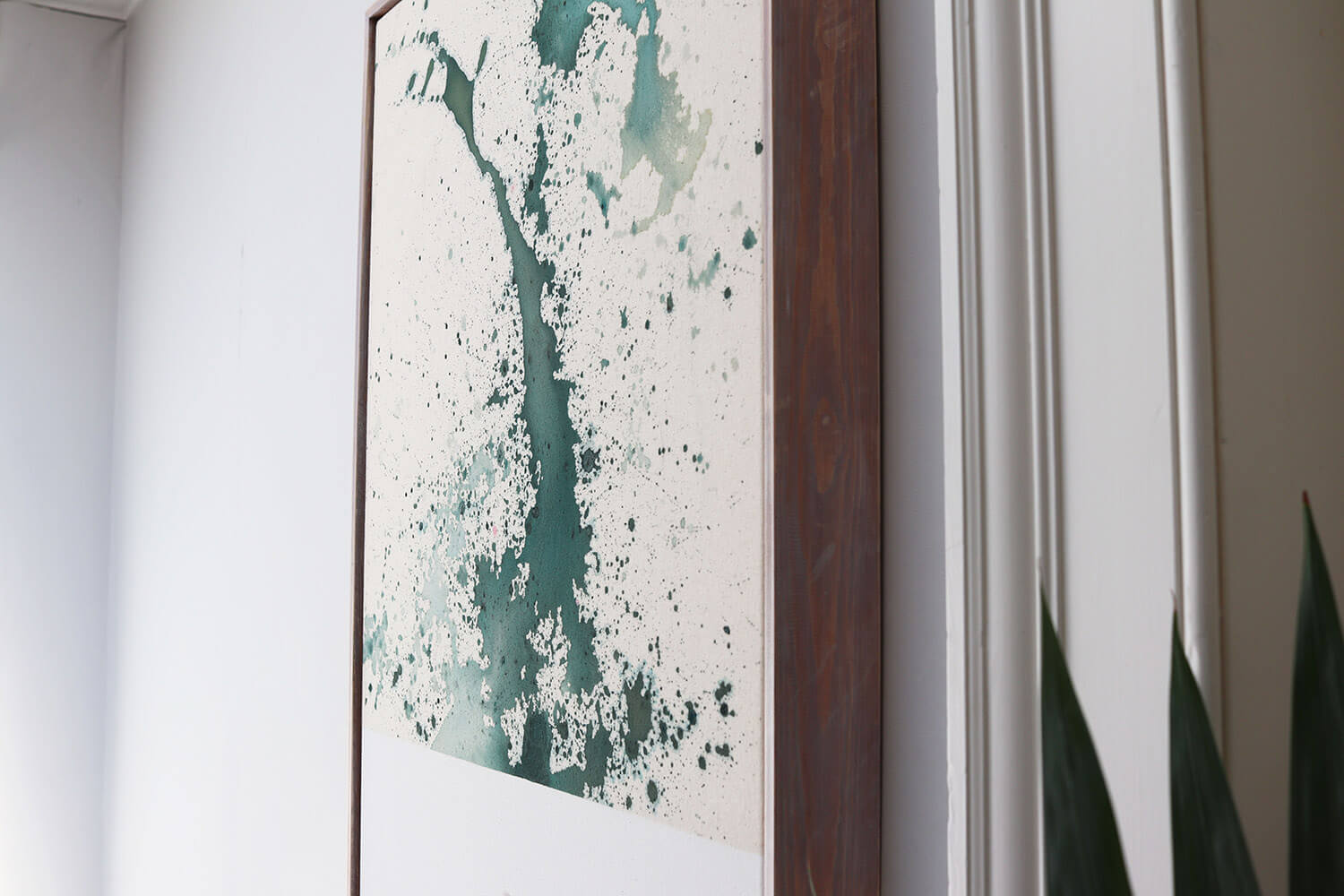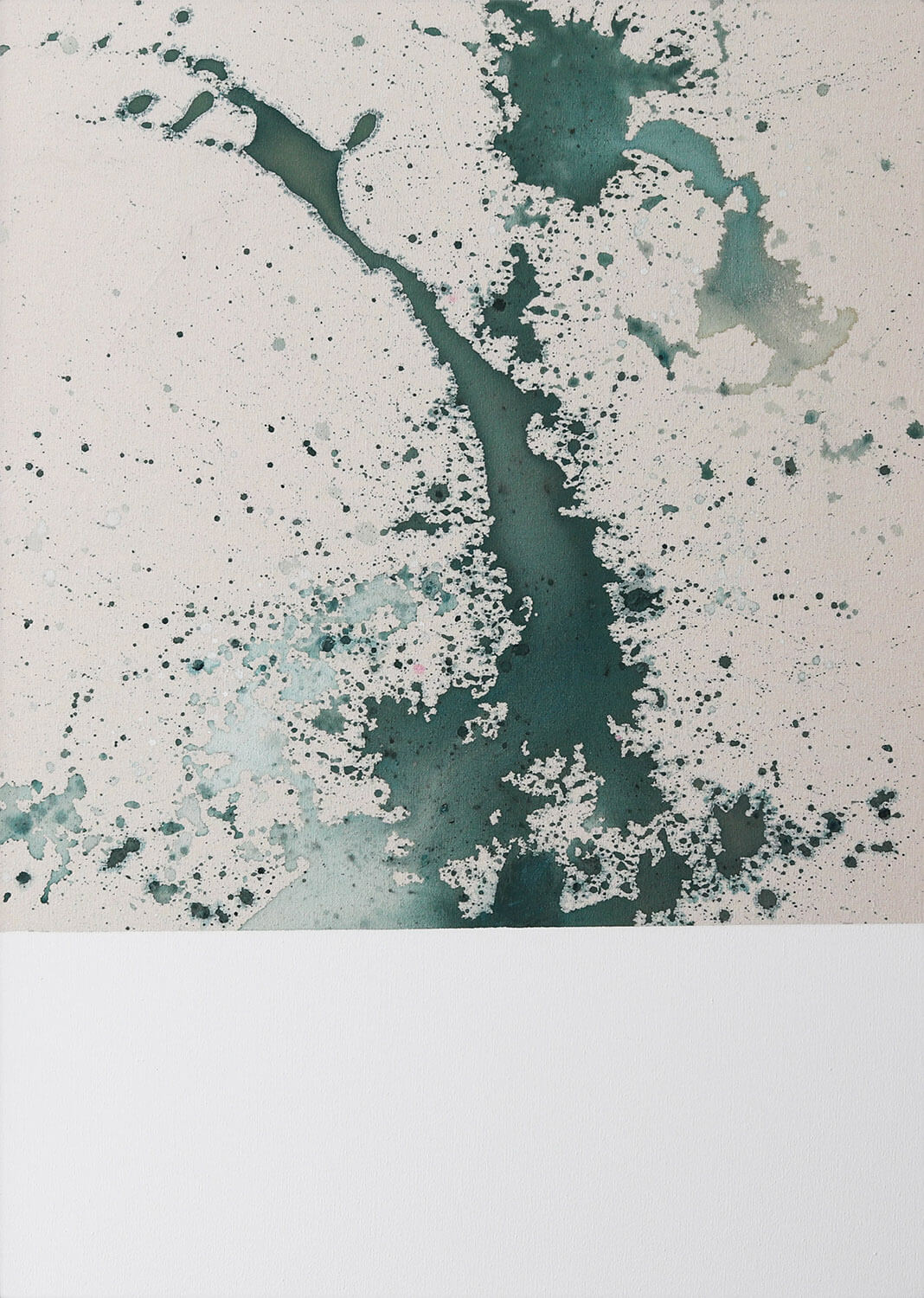 His recent work consists of large scale abstract landscapes on canvas and board alongside smaller more intricate studies on paper. His developed aesthetic is made up of dark weighty tones bringing depth and distance to the canvas. Accents of colour are skilfully used as compositional tools to entice the viewer to weave through layers and perspective.
