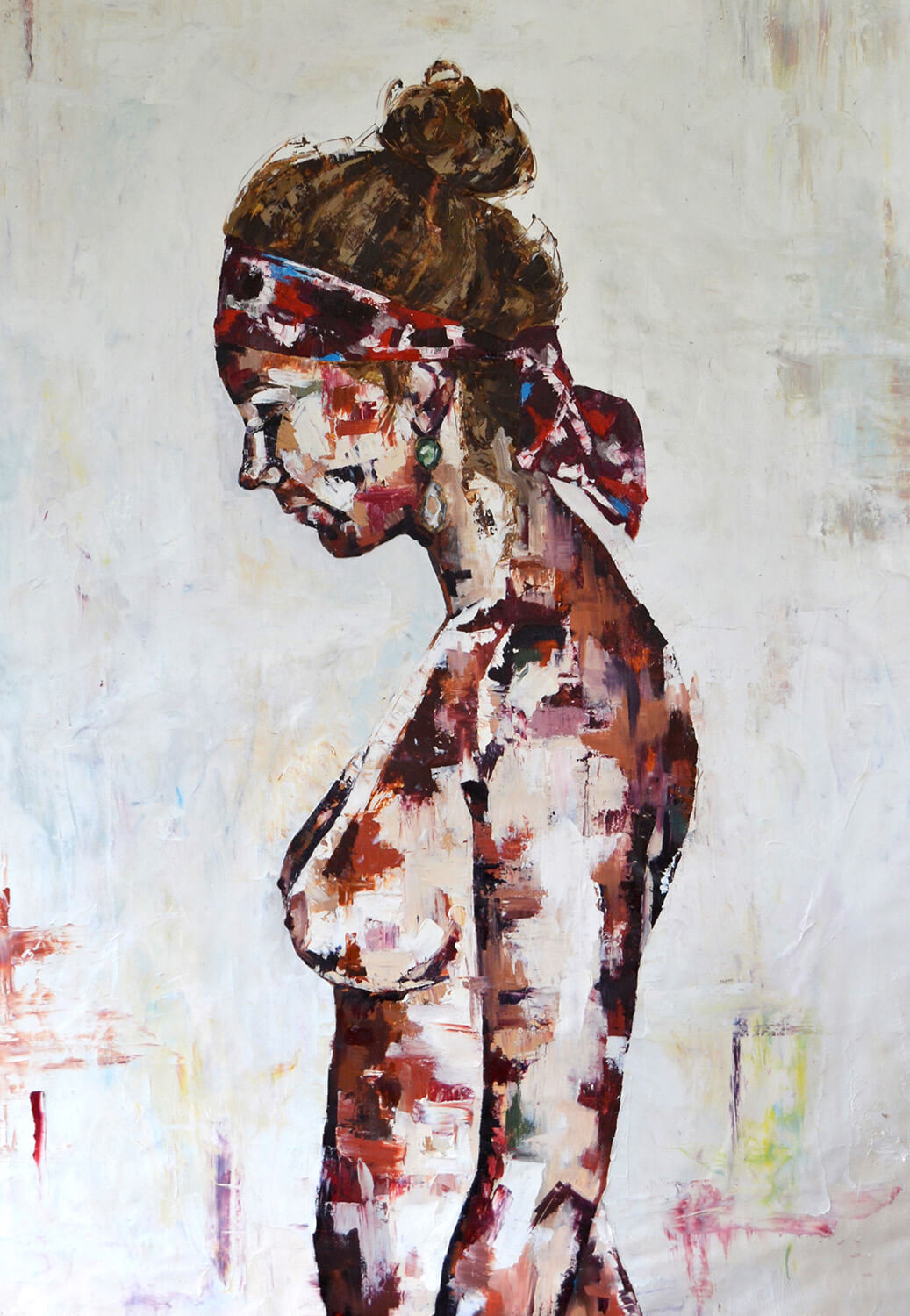 I make decisions about my work based upon how I am feeling. I know a piece has been successful when it has challenged and confronted me, it comes together as a whole and is energetic and commanding. I choose to use oil paint, it is malleable, thick and creates an incredible texture. Using a pallet knife alongside this means that I can drag the paint and also become less precious about my work, as it forces me to make mistakes.