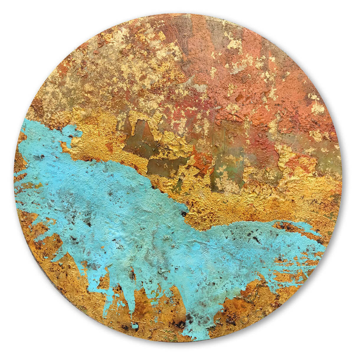 Original painting with oils and coffee burned onto circular steel plate.