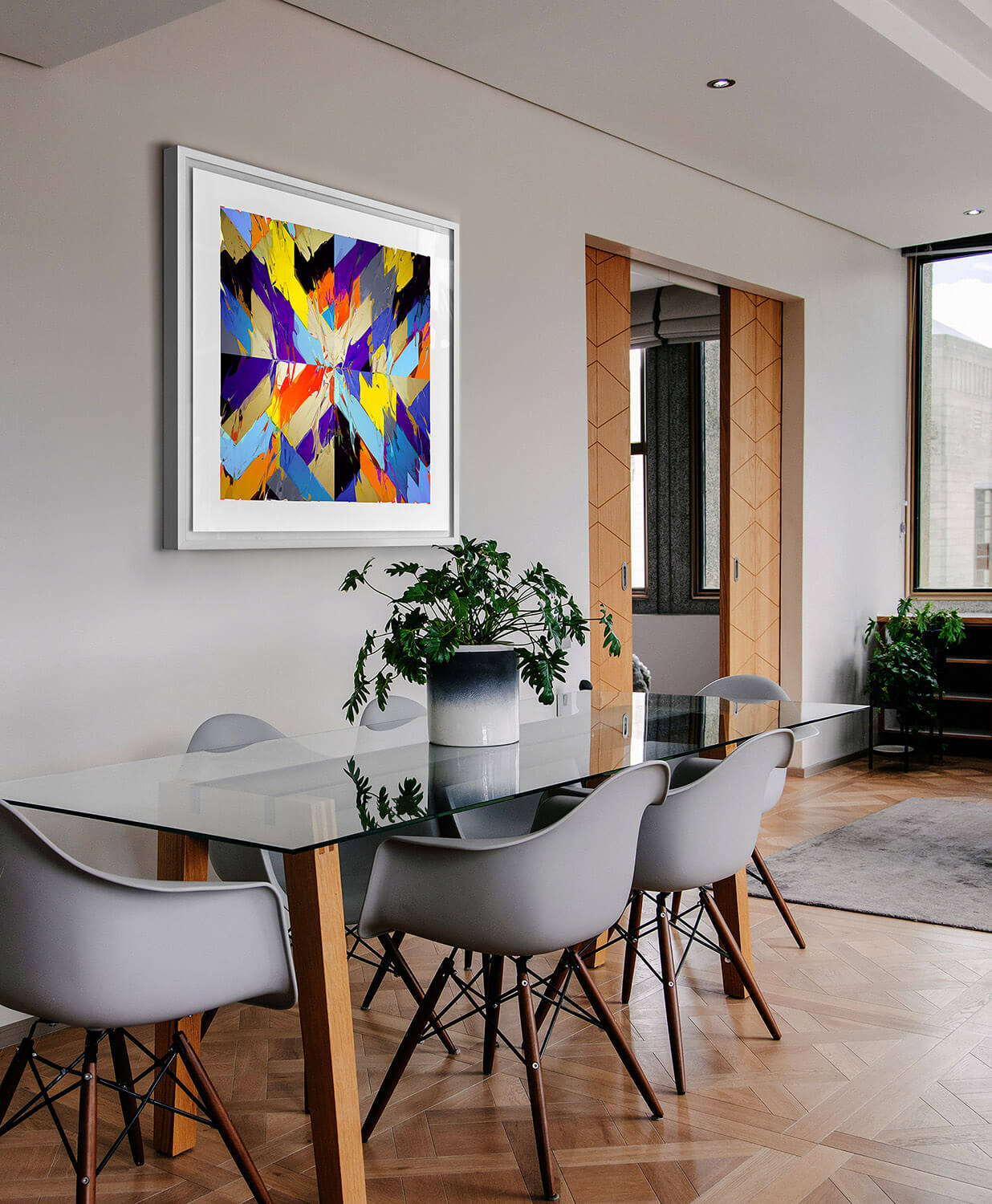 The works I generate are large format C type photographic prints. Original digital drawings exposed onto photographic paper by laser light, developed, fixed and washed in the traditional manner. These C type prints are then bonded to clear perspex using the Diasec process. The glazed pieces can then be laser cut to shape, framed, or simply mounted directly to the wall.