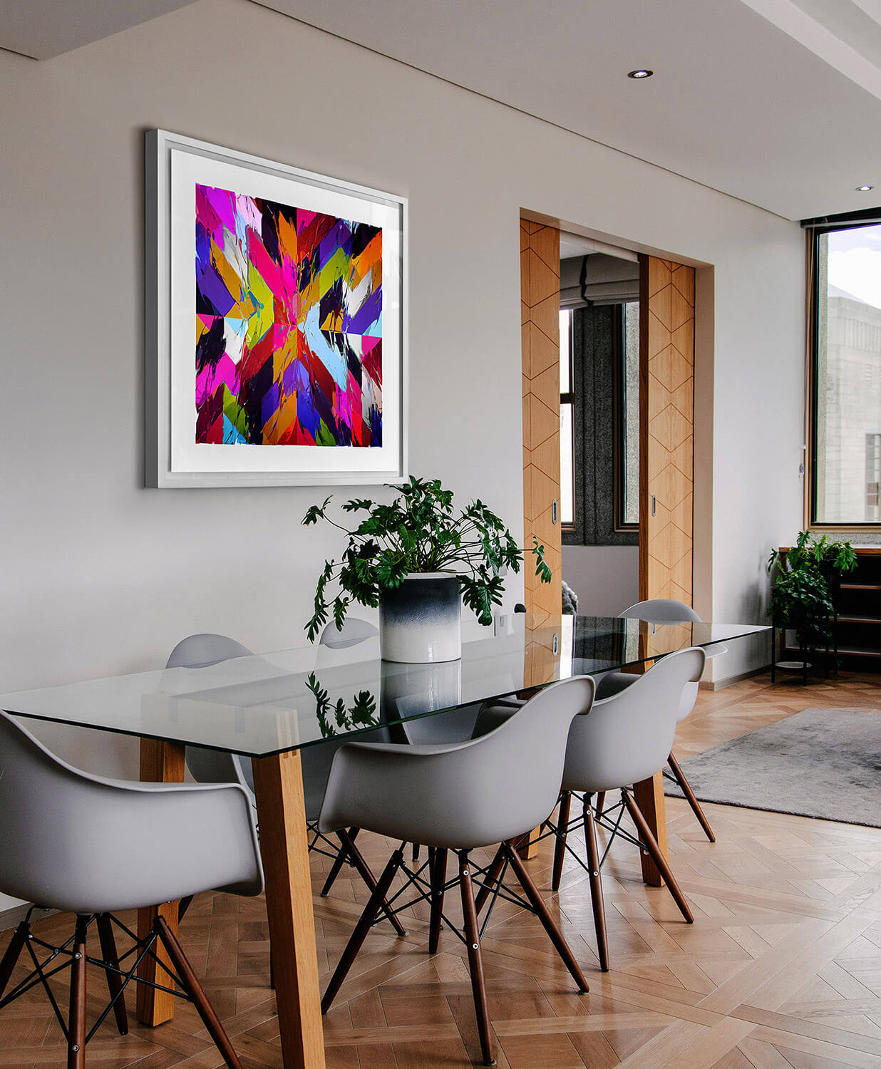 The works I generate are large format C type photographic prints. Original digital drawings exposed onto photographic paper by laser light, developed, fixed and washed in the traditional manner. These C type prints are then bonded to clear perspex using the Diasec process. The glazed pieces can then be laser cut to shape, framed, or simply mounted directly to the wall.